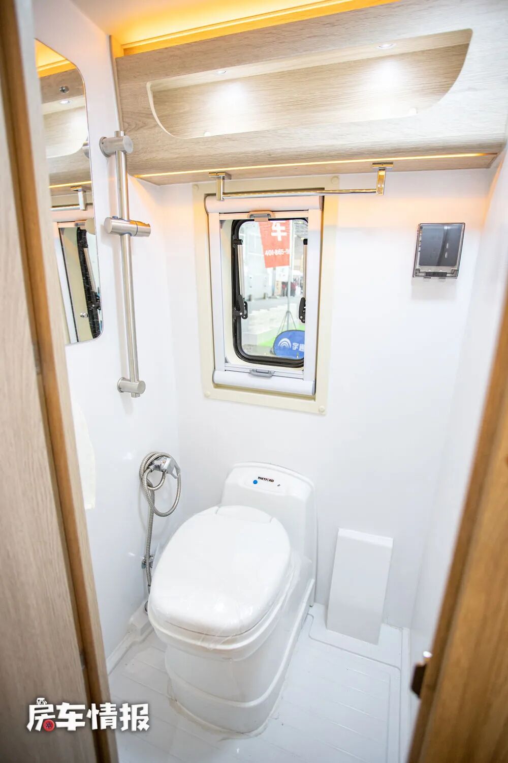 对面则为一间独立的卫浴室,内部的空间相较于一般B型房车来说要宽敞一些,提供了马桶、淋浴花洒、梳妆镜、置物架和换气扇等设施,完全能够满足出行的洗漱需求。