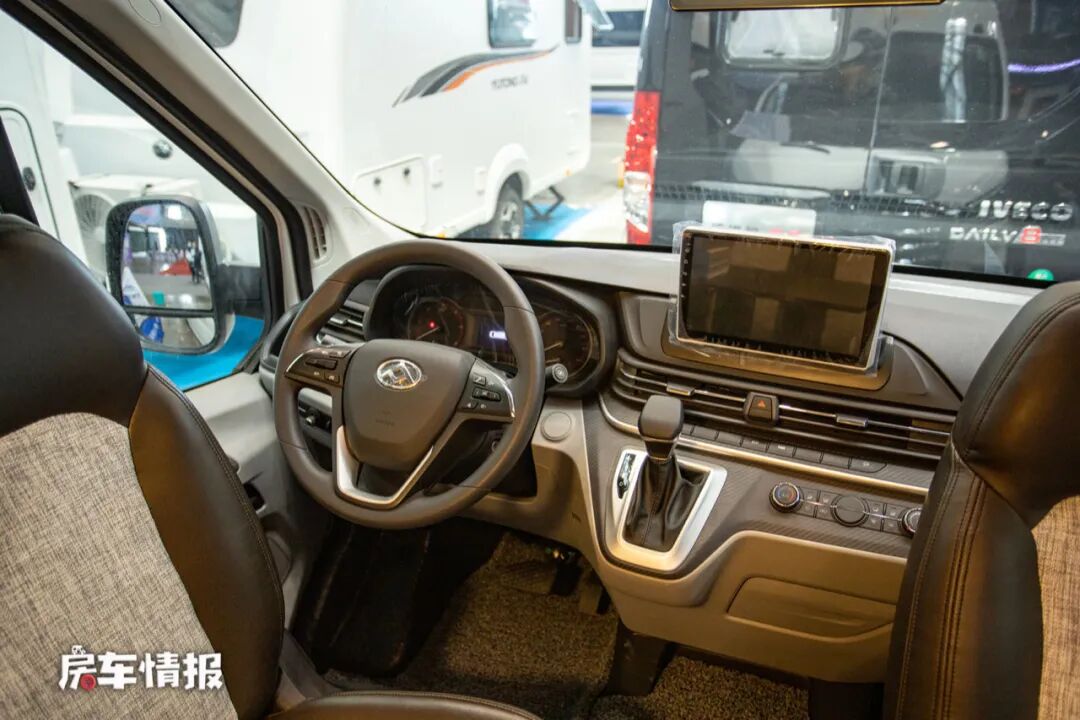 驾驶室保留了原车的设计风格,提供了多功能方向盘和中控显示大屏,主副驾驶座椅都采用超纤软包工艺并配有乘车扶手,另外座椅还带有旋转功能,减缓了乘车的疲劳感。