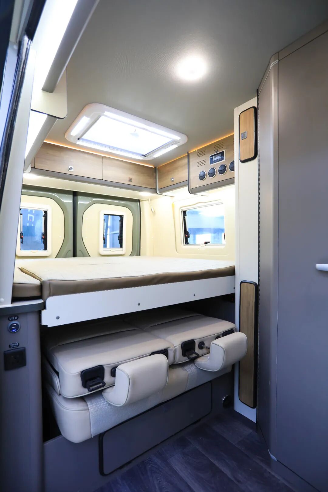 让舒适度更高的品质房车。景宴•栖550采用上汽大通V90长轴高顶底盘,可选6速手动/自动变速箱,搭载2.0T上汽π发动机,能达最佳燃烧效率。最大功率110KW,峰值扭矩375N•m,最高车速150km/h,油箱容积80L、尿素罐容积20L,核载4~5人,采用前置前驱后单胎,传动效率高,全承载式框架结构轻量化车身,强度高,质量轻。满足国六排放标准,C证蓝牌即可驾驶。