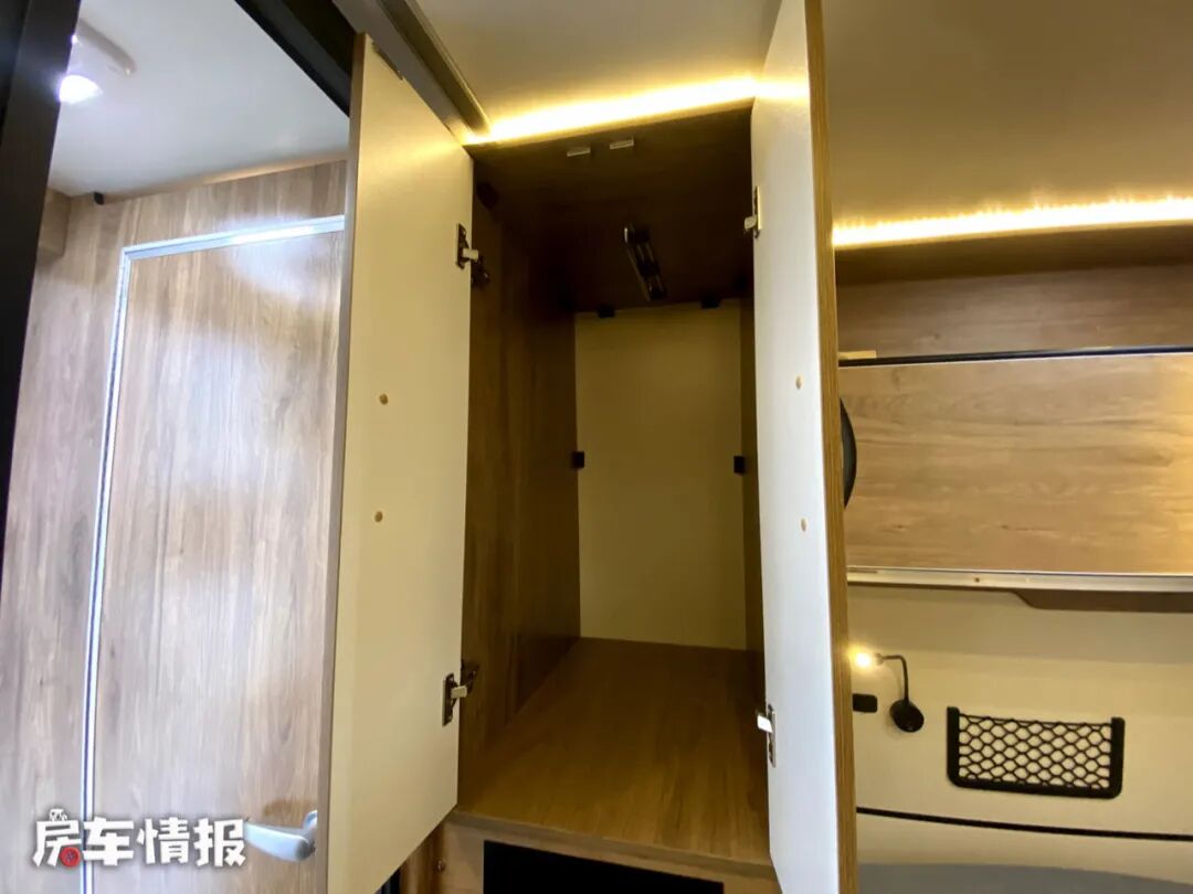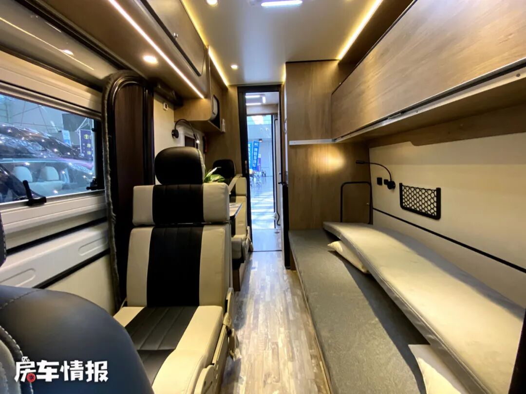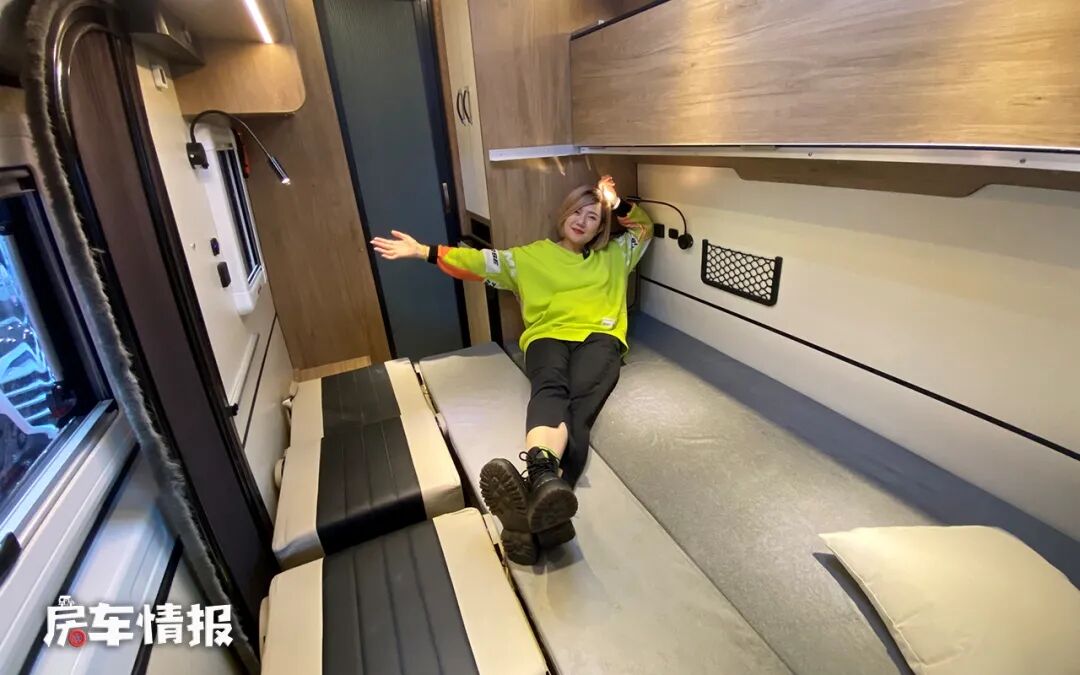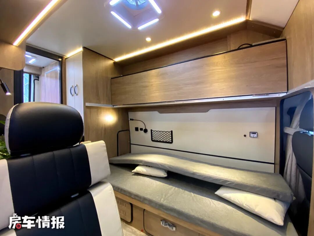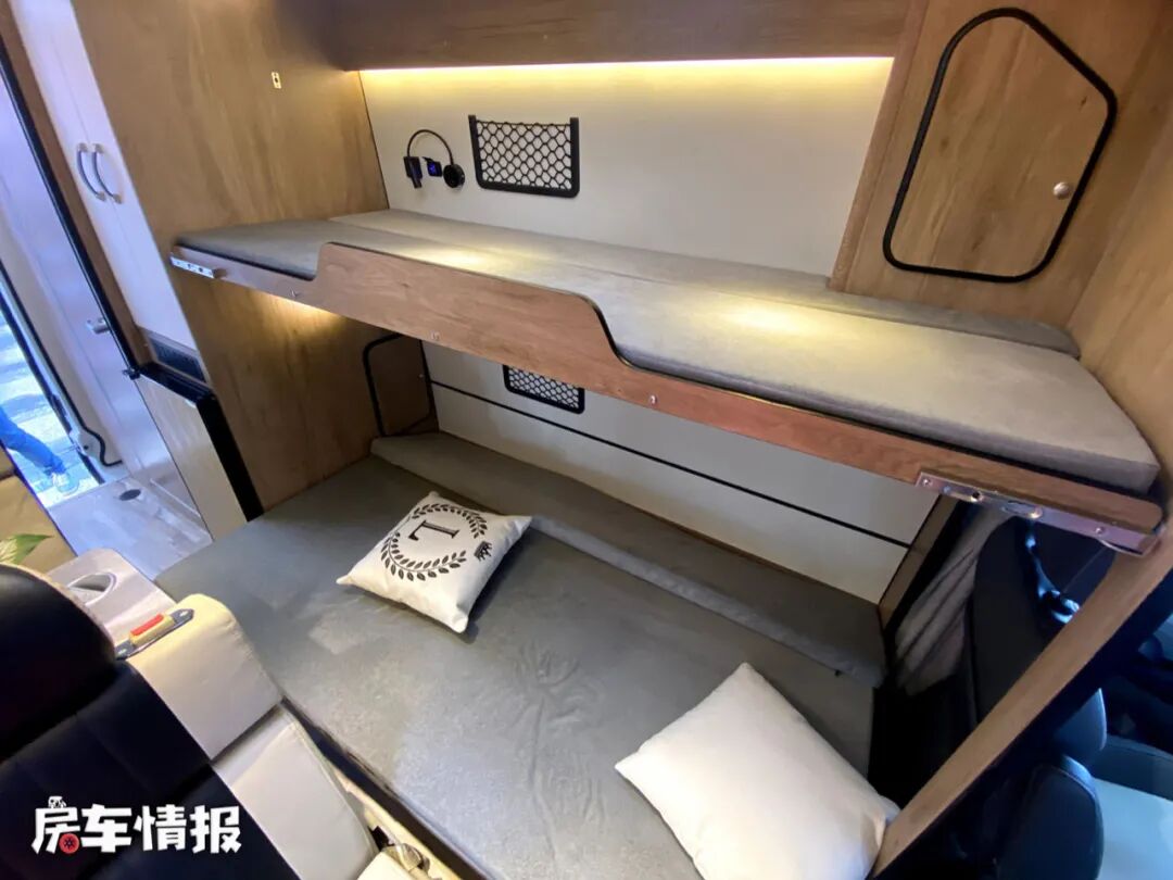 乘客区发生了位移,所以原本应该为会客区的地方也发生了改变,这款房车的主驾驶后方设计成了休息区,提供了纵置的上下子母床,总共可以为三个人提供休息使用,床头的侧壁板上还提供了收纳网,平时可以存放手机或者充电器。