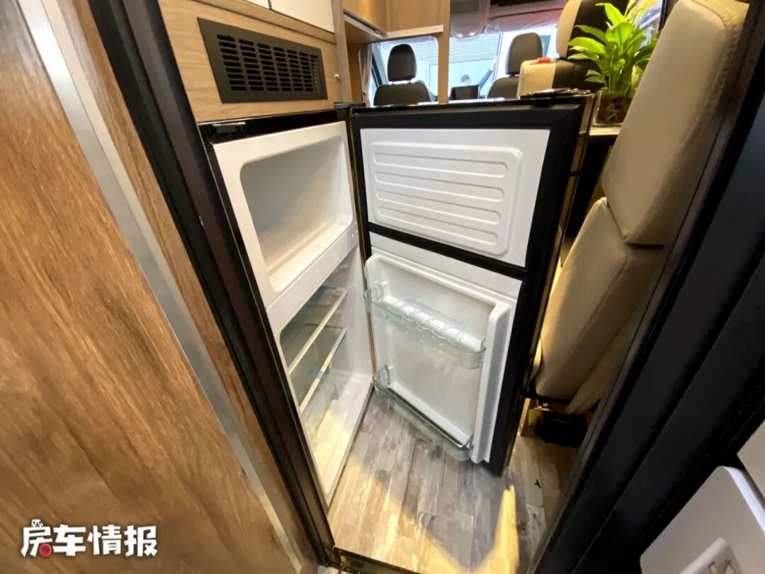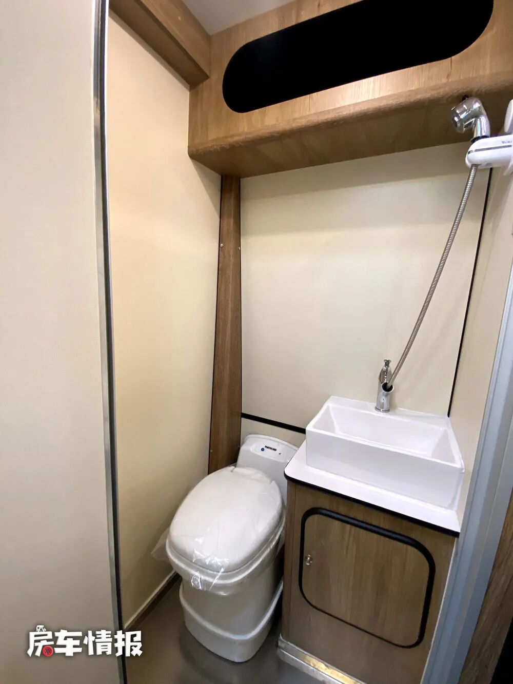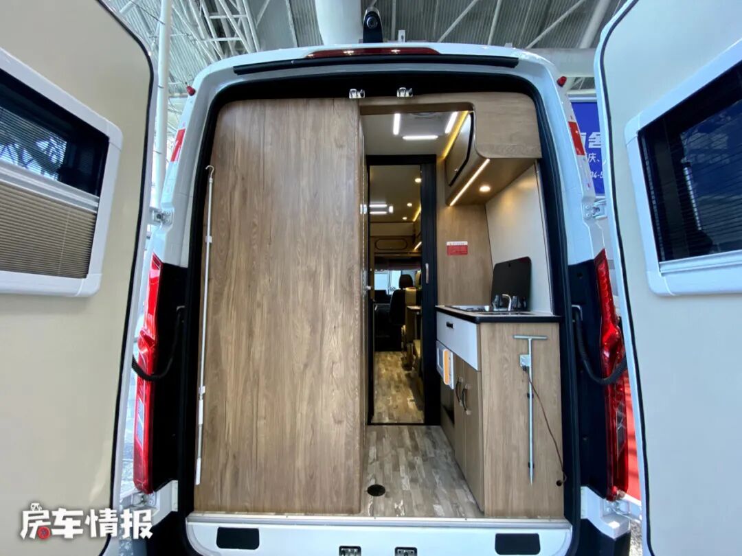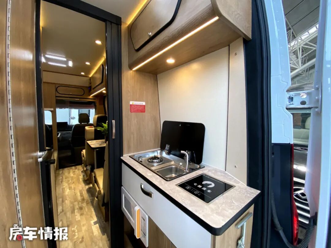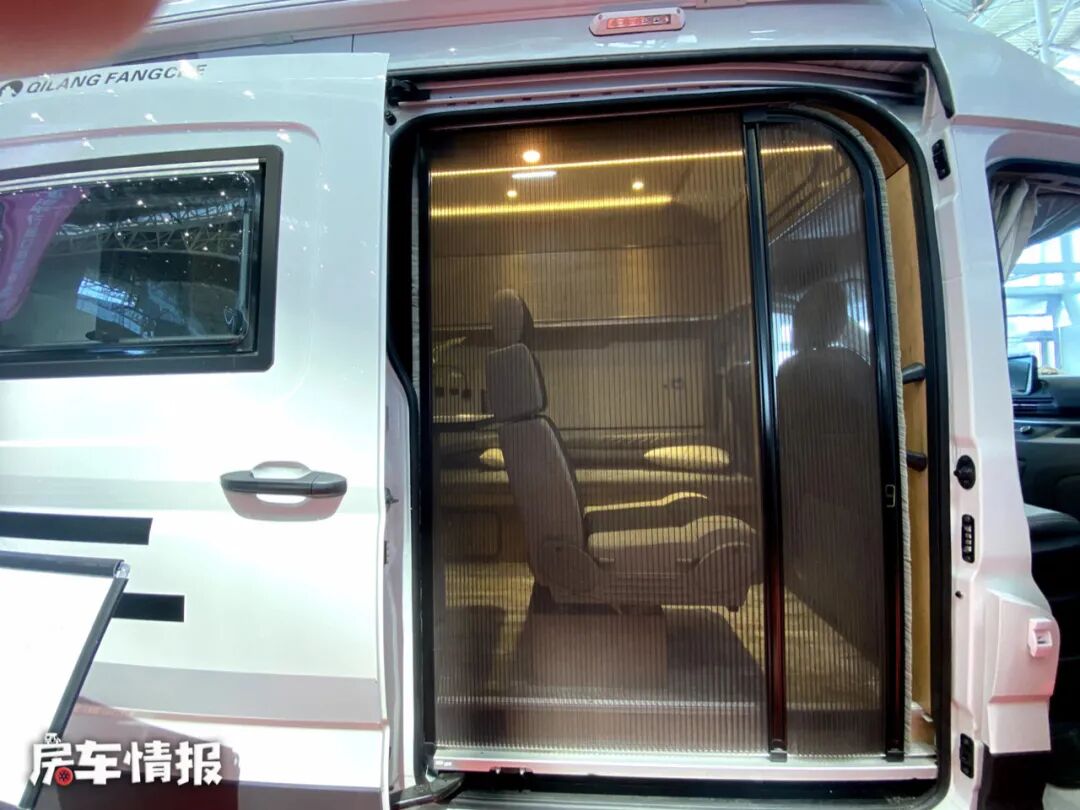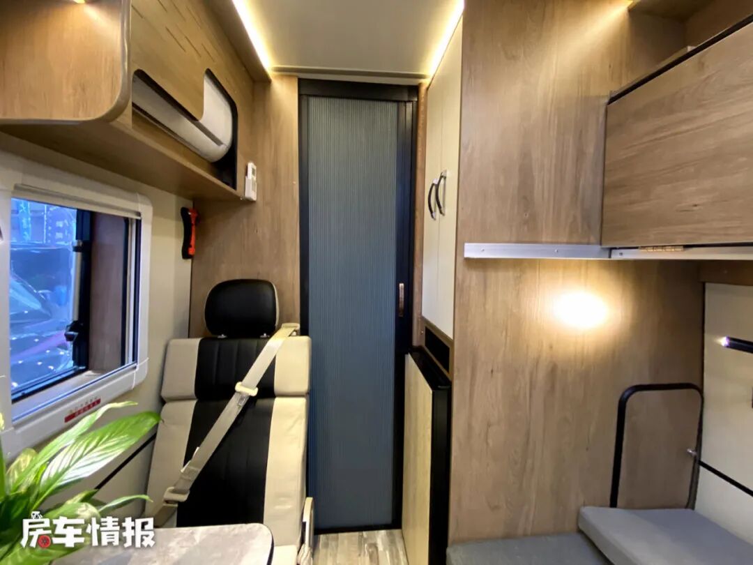 拉开推拉折叠门,可以到达车尾部的卫浴厨房区,小小的一扇折叠门,不仅起到了分隔区域的功能,还能防噪音,非常的有创意,
