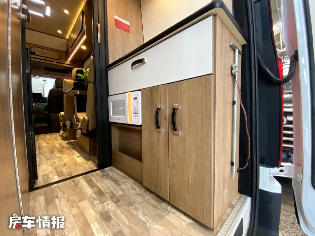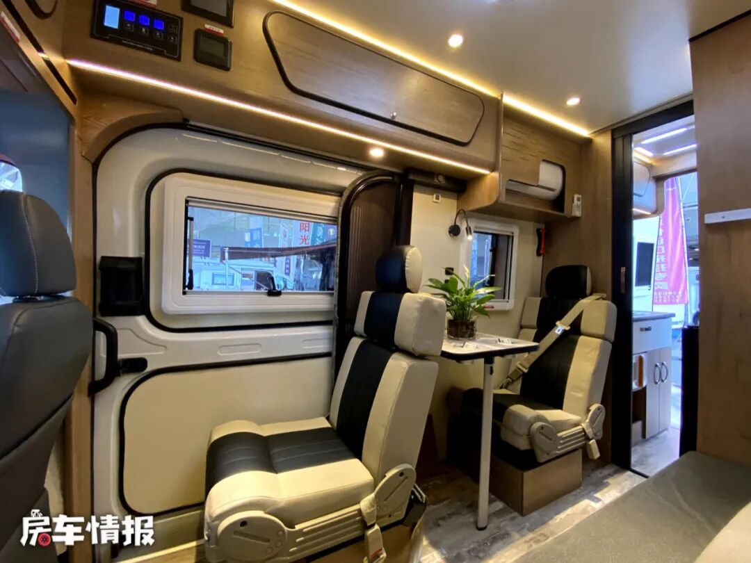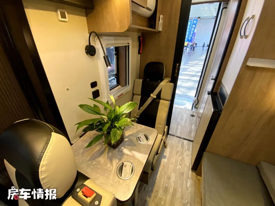 乘客门后方取消了常见的厨房区,而是全车的会客区,而且两个带有安全带的沙发座椅都是面向前方的,所以平时行车时乘坐起来更加的舒适,驻车休息时,就可以将前座旋转向后,与后座形成一个面对面的空间,中间也提供了可折叠的小餐桌,整体的设计都更加的人性化。