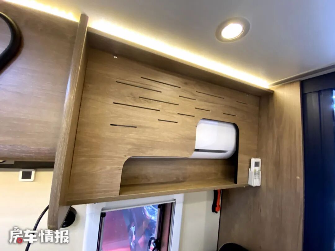 会客区顶部前方提供了一个大尺寸的储物吊柜,后方则暗藏了一部变频空调,使用起来也非常的方便好操作。