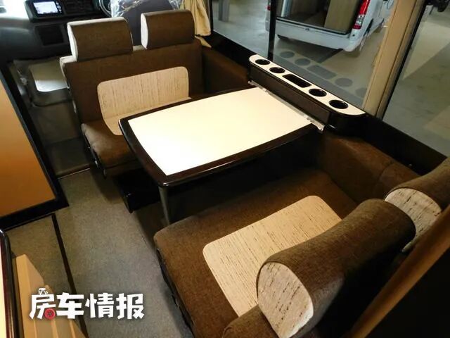 如果驻车的时候需要聚餐吃饭,就可以将前排的双人沙发向后旋转,与后排沙发形成一个面对面的交流空间,中间放置一张可折叠移动的餐桌,就搭建成了一个简单的会客区。