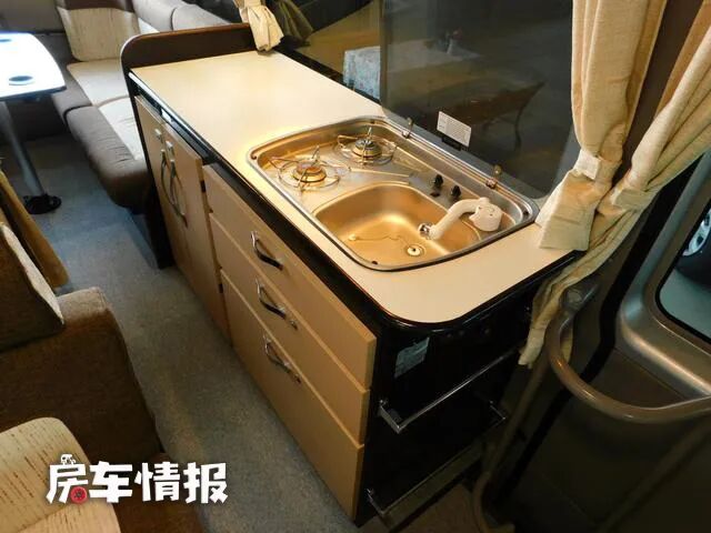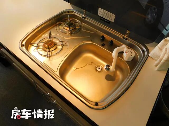 乘客门的后方是厨房操作台,台面的面积也比较宽敞,不仅提供了双孔燃气灶和不锈钢水盆,还提供了空置的台面,就是燃气灶与水槽之间的距离有点紧凑。