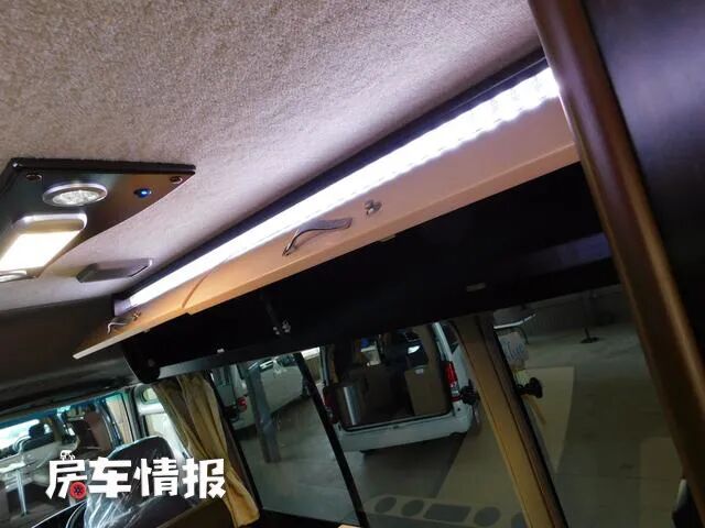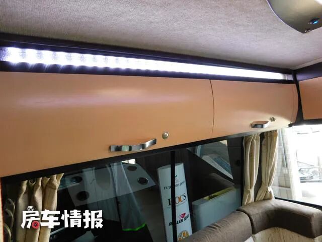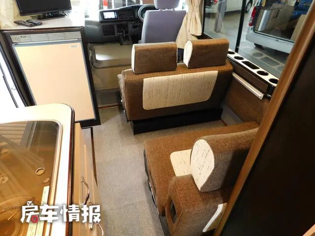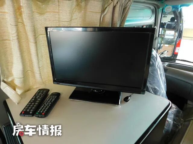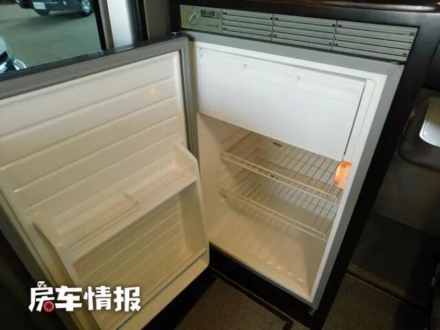 乘客门前方的小区域被设计成了电视柜,上面放置了一台19英寸的液晶电视,下面的箱体中则镶嵌了一台90L的冰箱,非常实用的设计。