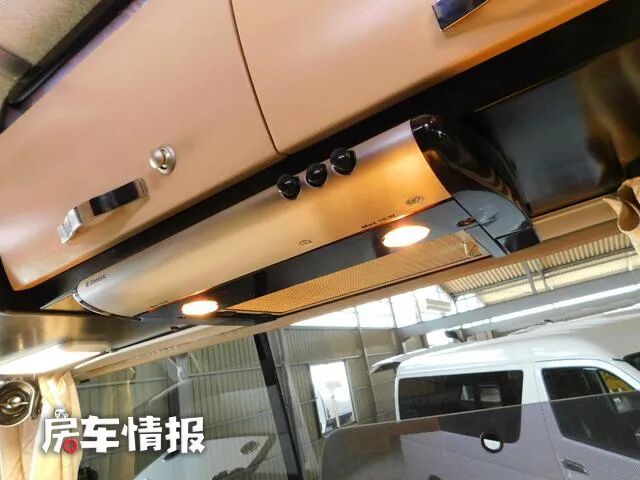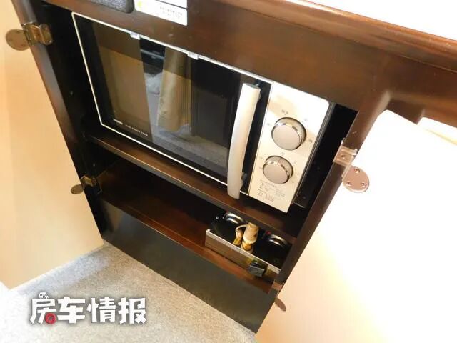 台面下方左侧的双开门箱体中配备了一台微波炉,右方则全部为储物抽屉,平时可以存放烹饪工具等,上方还提供了一台抽油烟机,减轻车内大火猛炒带来的油烟问题。