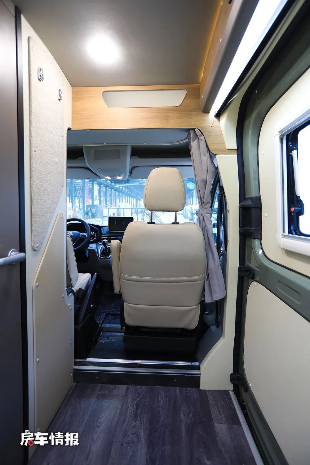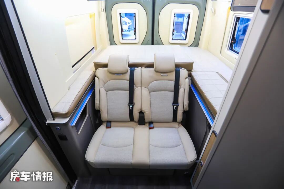 从车身右侧的乘客门进入车厢,内部采用了米黄色为主色调,家具也配备了棕色的木纹面板,搭配氛围灯看起来非常的明亮和温馨。