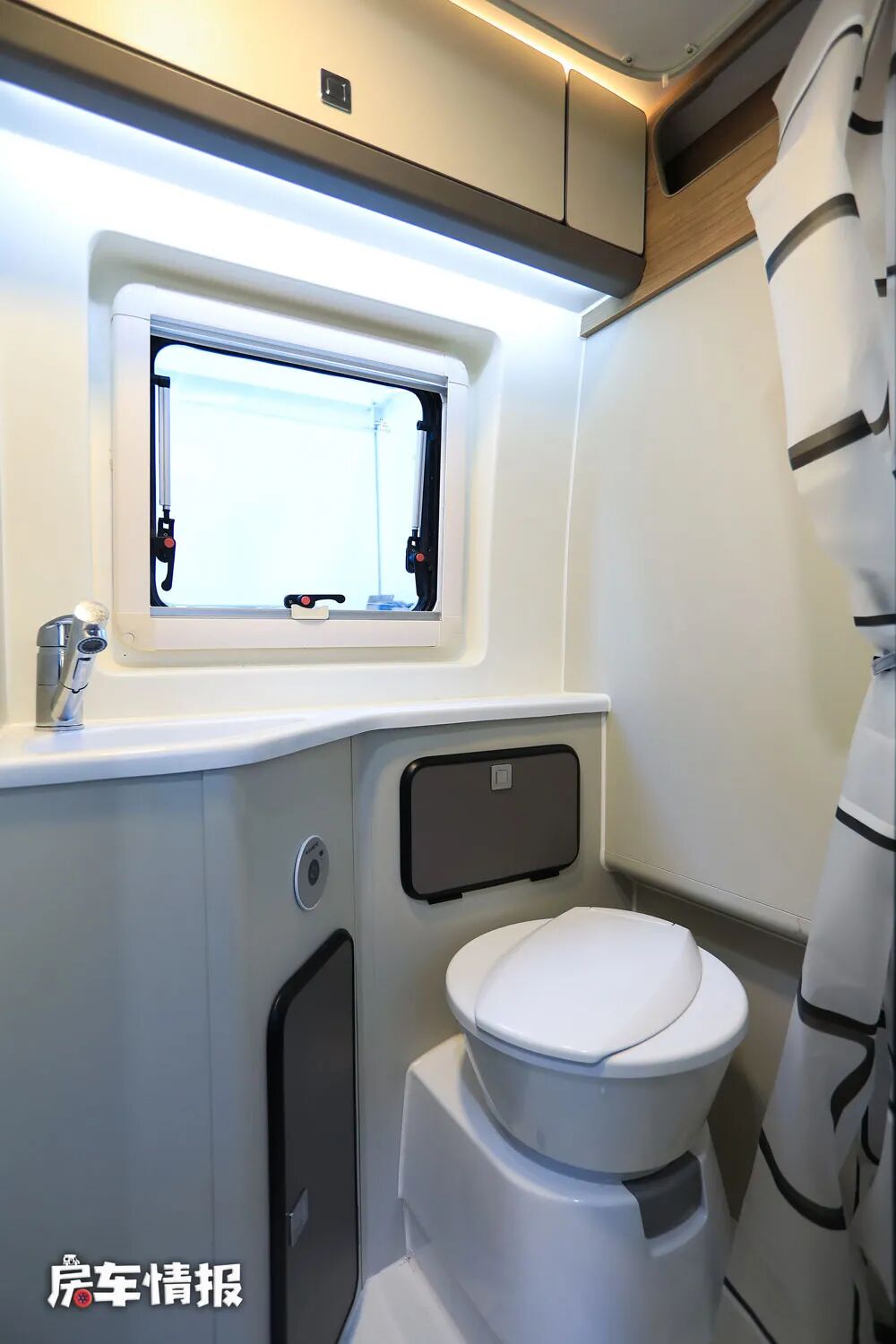 正对乘客门的是一间独立的卫浴室,地面铺设了防水柚木地板,并配备了马桶、洗手池、可拉伸的水龙头、梳妆镜等淋浴设施,镜前采用了方便实用的触摸灯,设备比较齐全,可以满足平时出行时洗漱的需求。