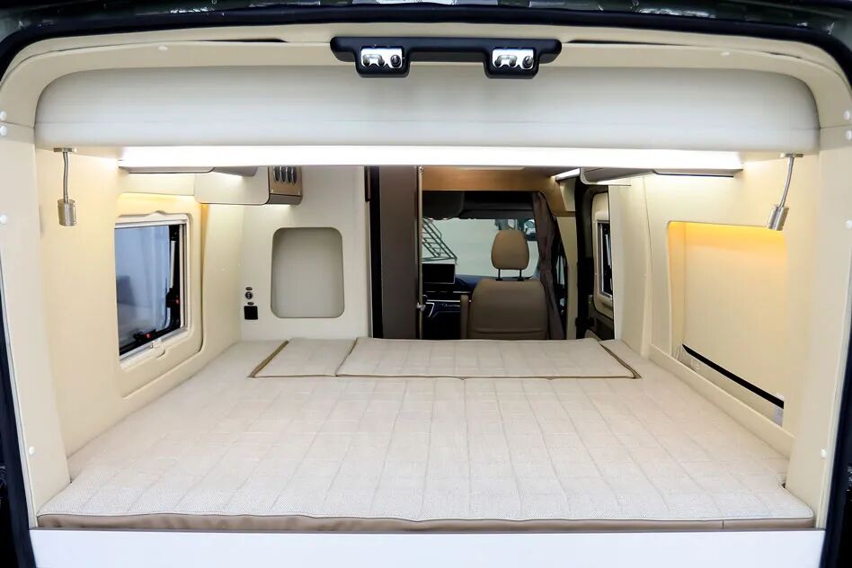 晚上休息的时候,可以将座椅向前折叠,将床垫铺好,就可以得到一张尺寸为1950×1000(mm)的双人床,完全能够容纳两个成年人休息使用。