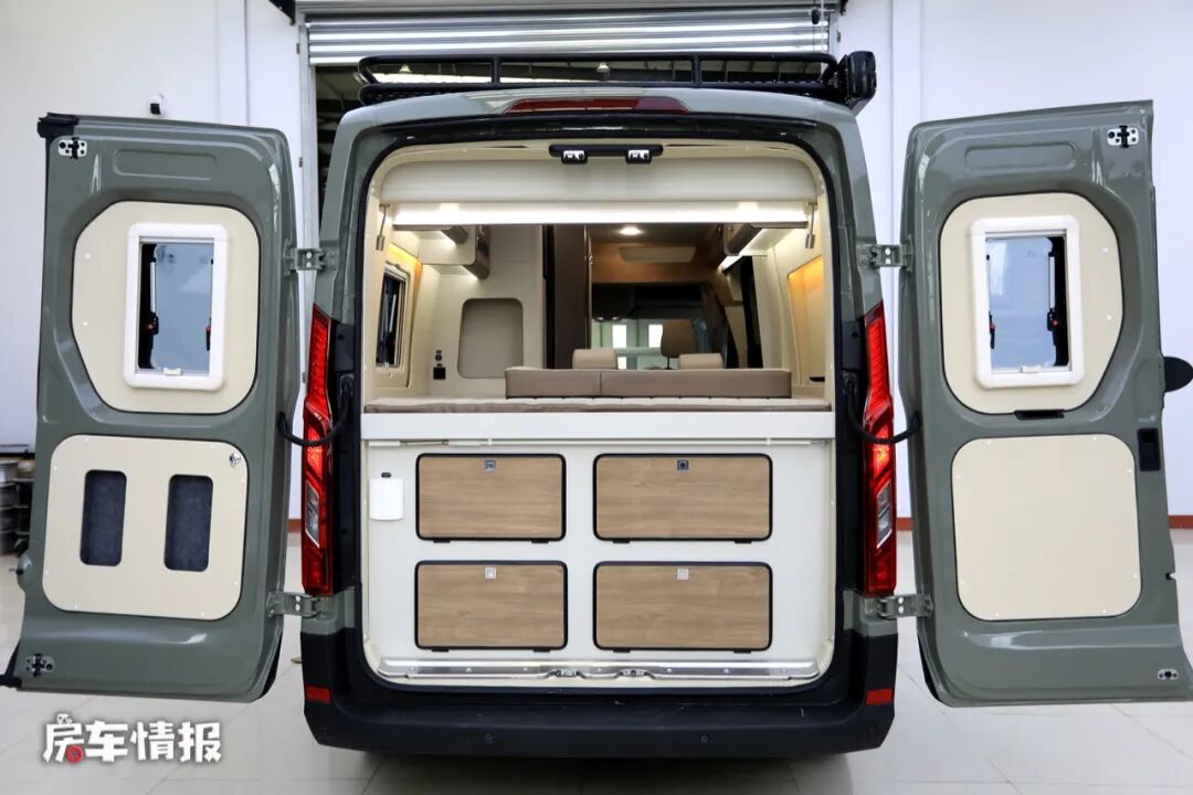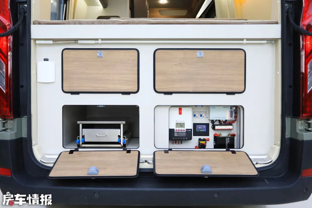这款房车的后车门可180°打开成平面状态,打开后车门可以看到四个带有木质面板的储物箱体,其实这部分更像是一个户外的料理台,其中左下角的箱体里面配备了一台可抽拉的燃气灶台,不用担心像在车内炒菜做饭时带来油烟。左边还提供了一个出水口,平时可以连接水管洗菜,使用起来也比较方便,不占用内部生活空间。