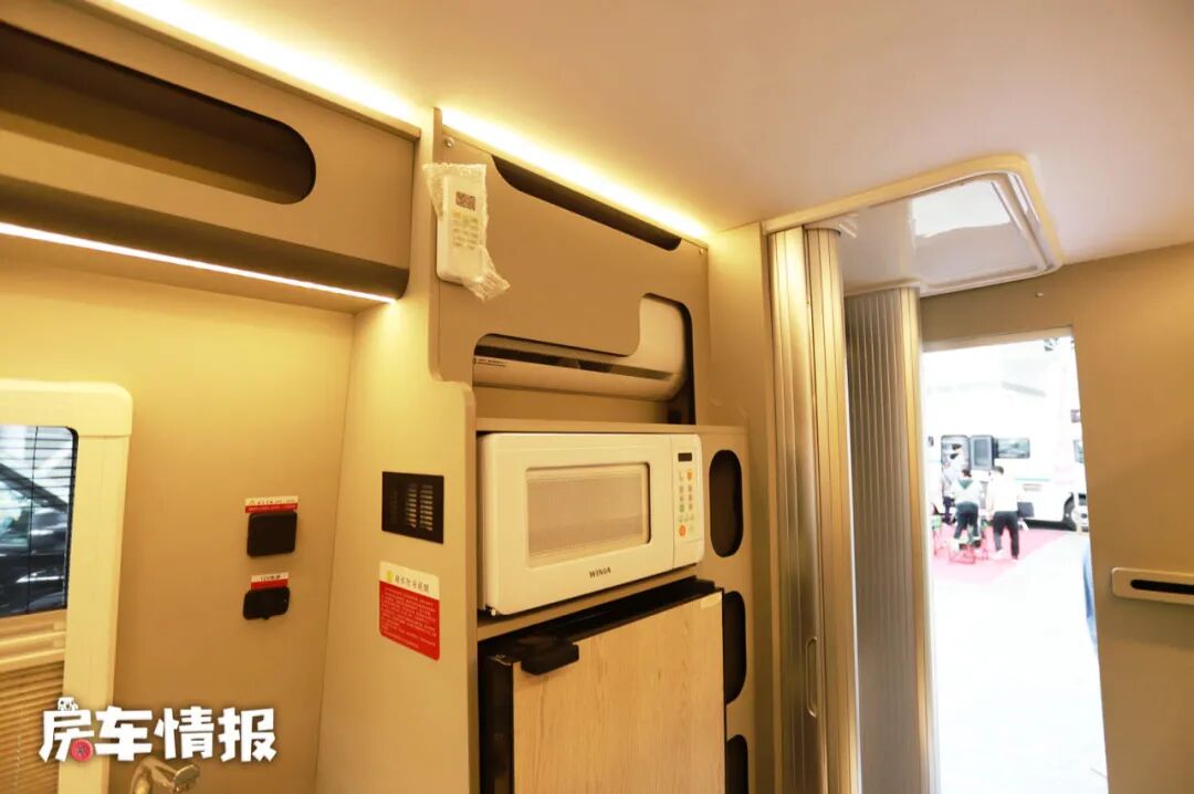 另外在微波炉上方还提供了一台12V车载变频空调,旁边带有匹配的遥控器,随时可以按需调节车内的温度。