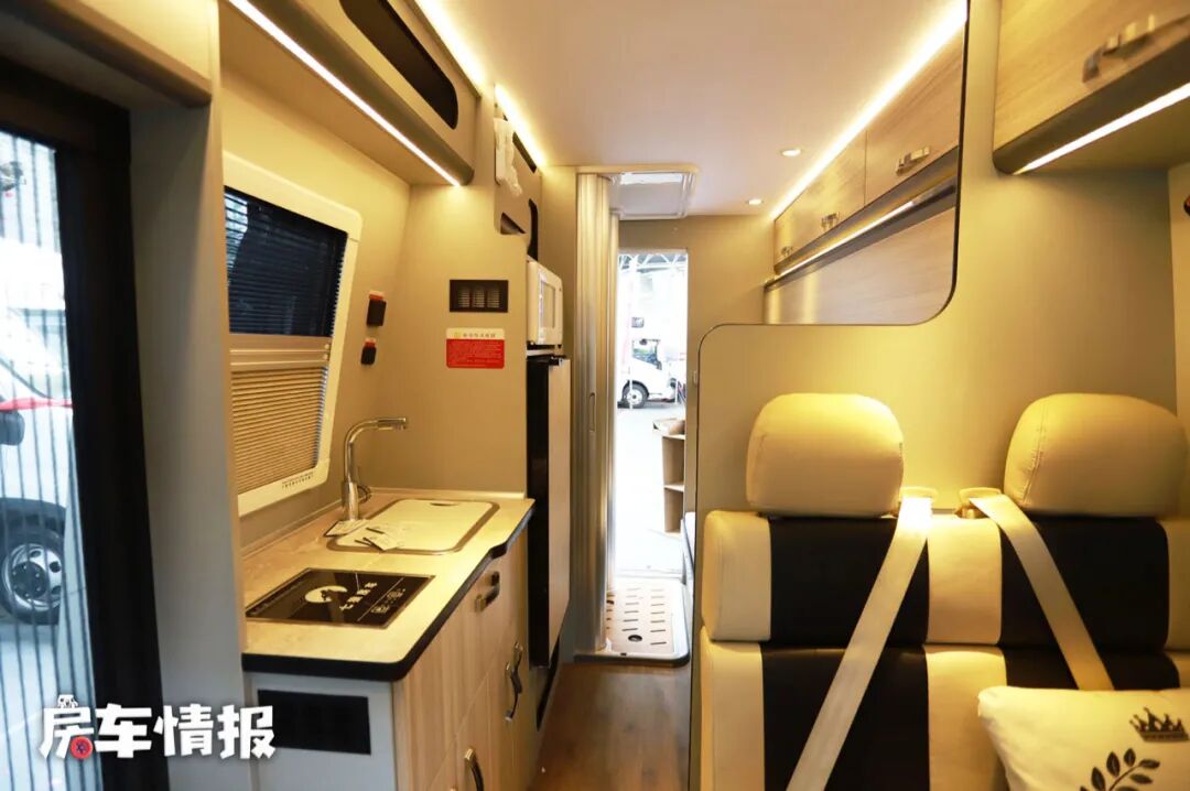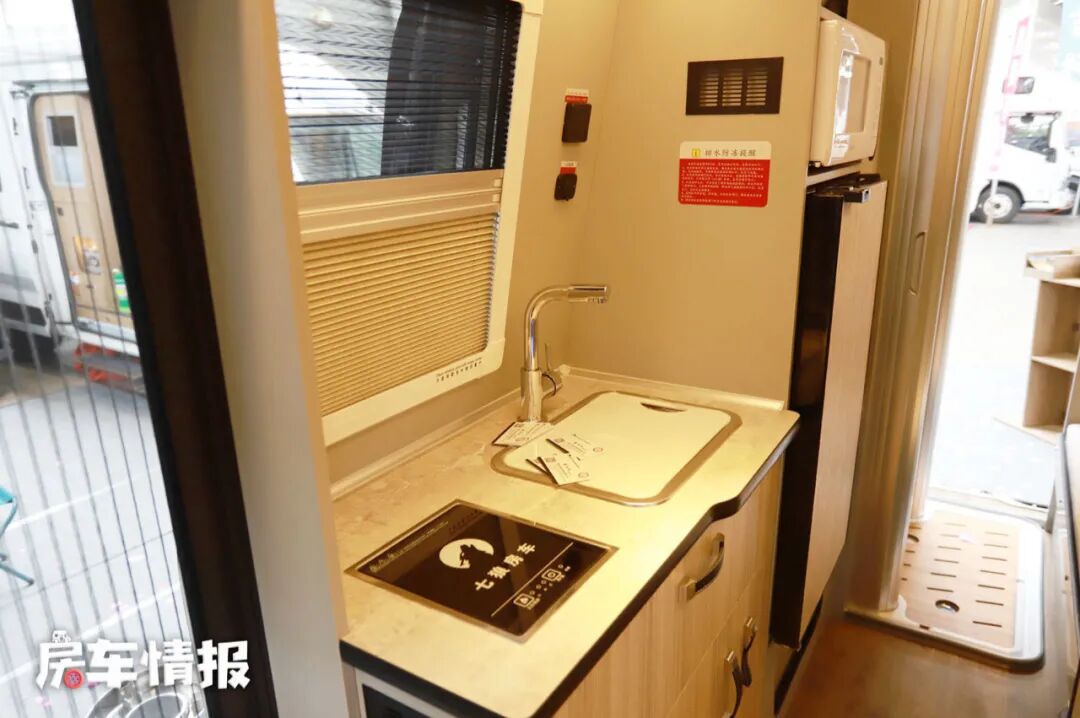 乘客门处的厨房区配套设施还是比较丰富的,提供了电磁炉、带盖的不锈钢水槽、大宇的微波炉以及一台85L的车载冰箱。