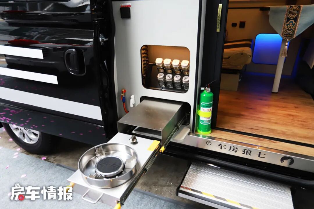 操作台的外侧还暗藏了一个外置的抽拉燃气灶,平时需要大火猛炒的时候可以在车外进行操作,上方还带有可放置料理瓶的置物架,设计非常的人性化。