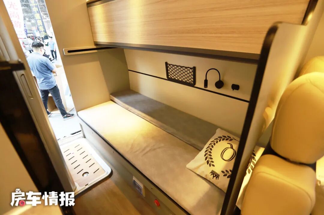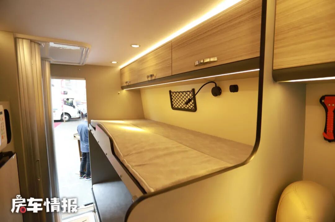 会客区后方的休息区内提供了纵置的上下床,尺寸分别为1900*800mm,上下各可以容纳一个成年人,上床还带有可翻折的功能,平时白天驻车的时候也可以翻折起来,下方床板还带有拓展功能,尺寸可增加到1900*1180mm,提供更多的生活空间。