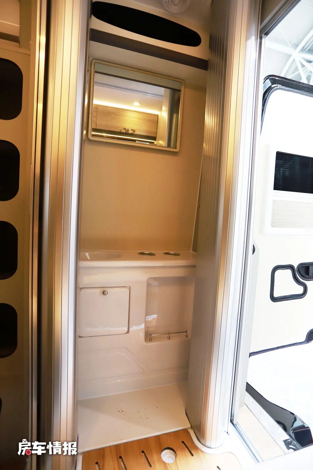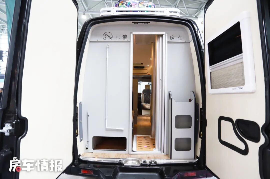 最后是车厢尾部的夹缝区域,整体设计和常见的B型房车尾部区别较大,一个单独的小车门可以方便进出,同时还带有纱门防止蚊虫进入,另一侧设置了置物架,平时可以存放雨伞或者鞋子。