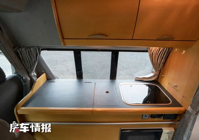 不得不说,这个小小的厨房区几乎涵盖了所有厨用设备,同时也是我们之前介绍过的几款B型房车中配备最齐全的了。