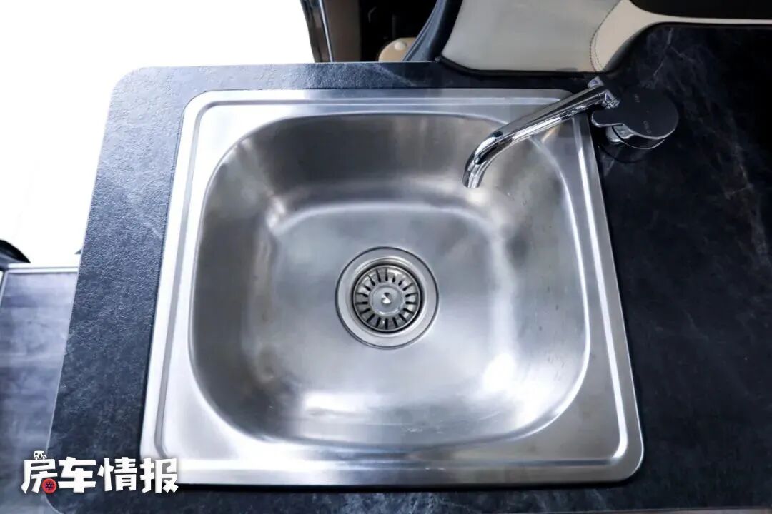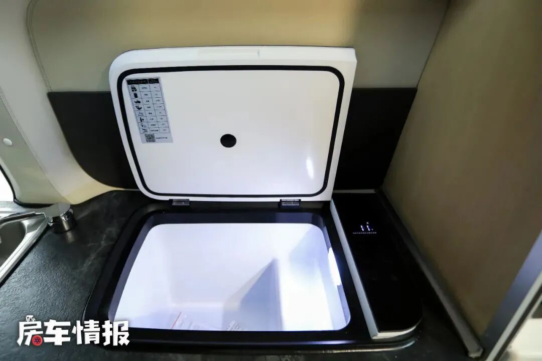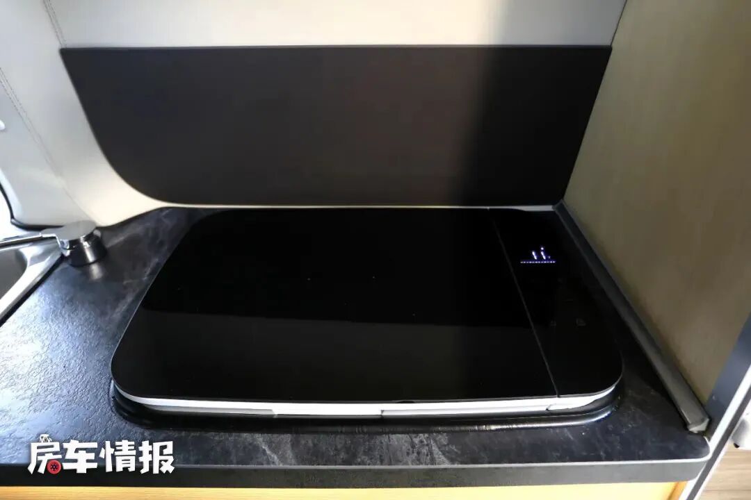 临近乘客门处的厨房操作台则是使用了常规的设计,配备了进口的带盖不锈钢水盆、800W的电陶炉以及一台48L的进口赛特福德车载冰箱,满足平时做饭所需。如果后期有更多的烹饪需求,也可选装进口的特鲁玛燃气系统配合不锈钢双炉头燃气灶水盆一体机和进口的whirlpool触控式微波炉。