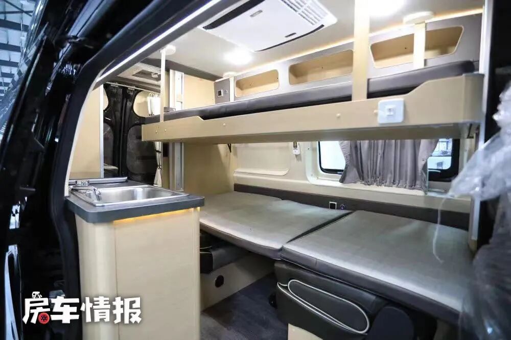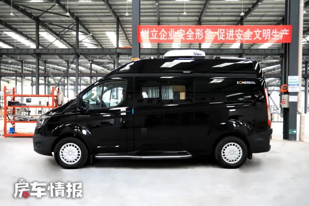 全车采用黑色为主色调,突显了整车的商务风。车身右侧上方提供了熏黑色的手动遮阳棚和燃气接口,左侧则配备了水电接驳口,方便平时为车辆进行补给。