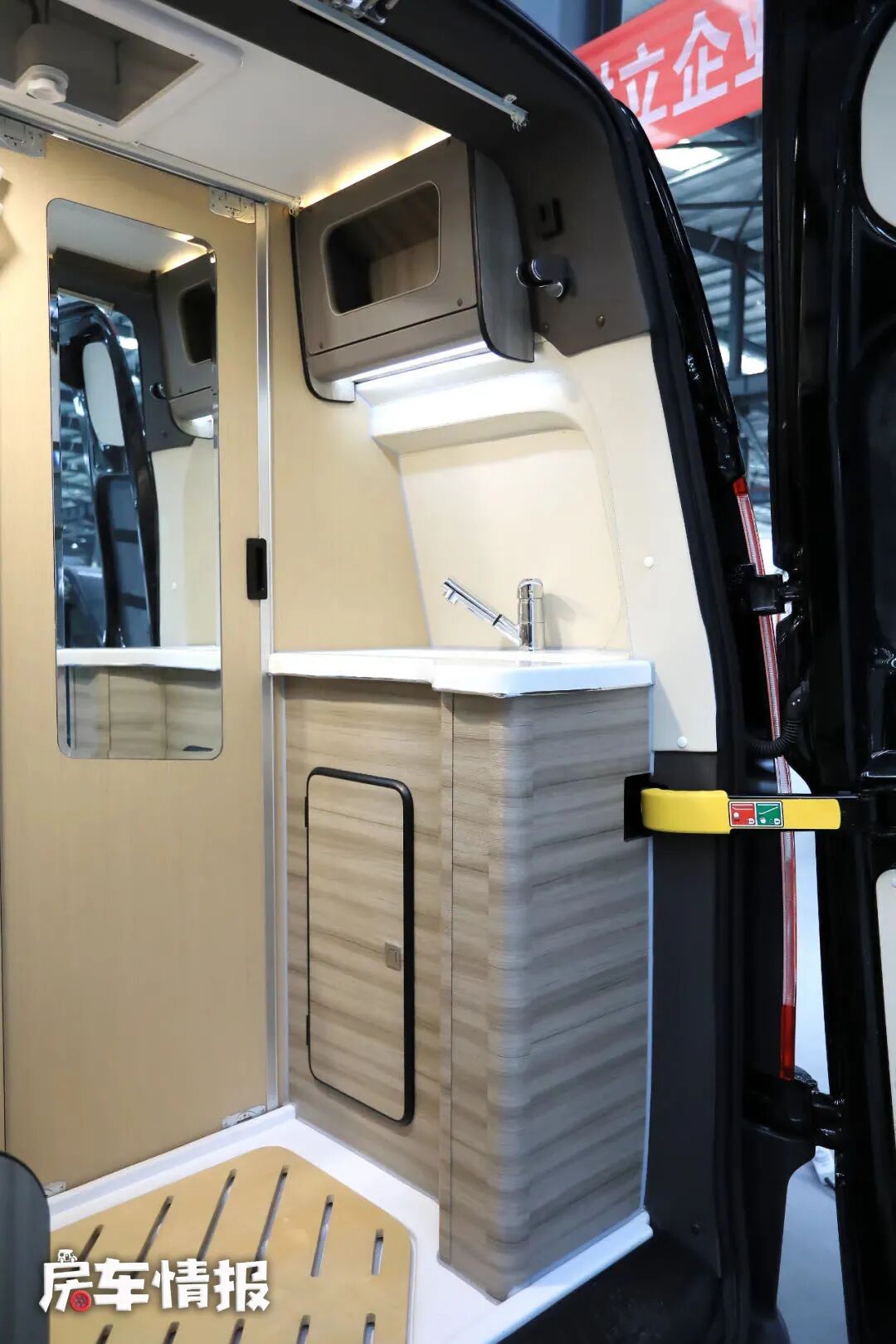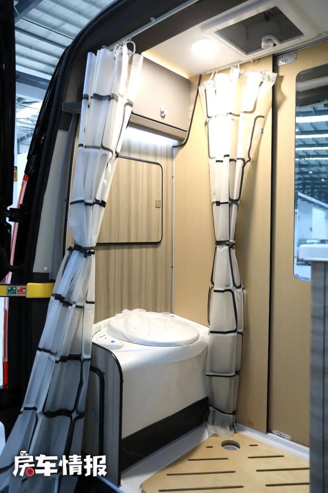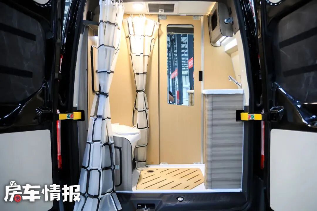车厢尾部设计成了一个带有平开门的卫浴一体区,不仅从车厢前部可以进入,也可以打开后尾门从尾部进入。