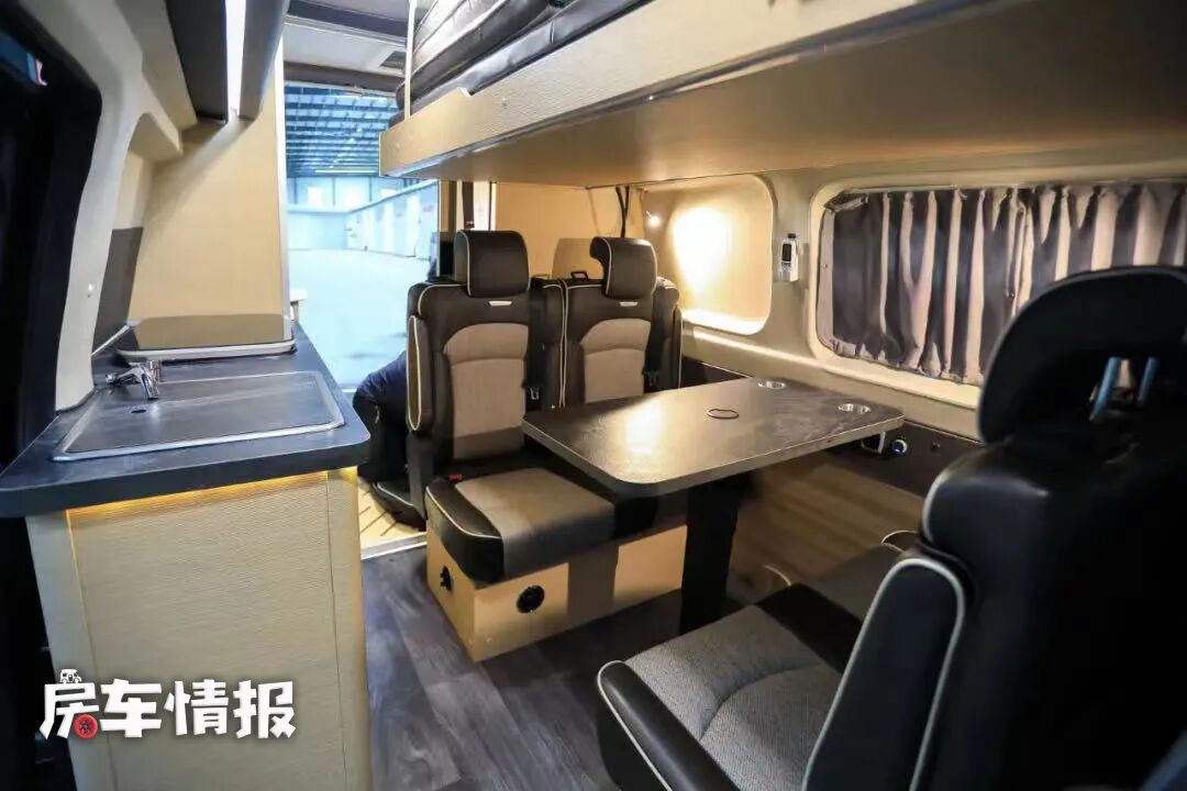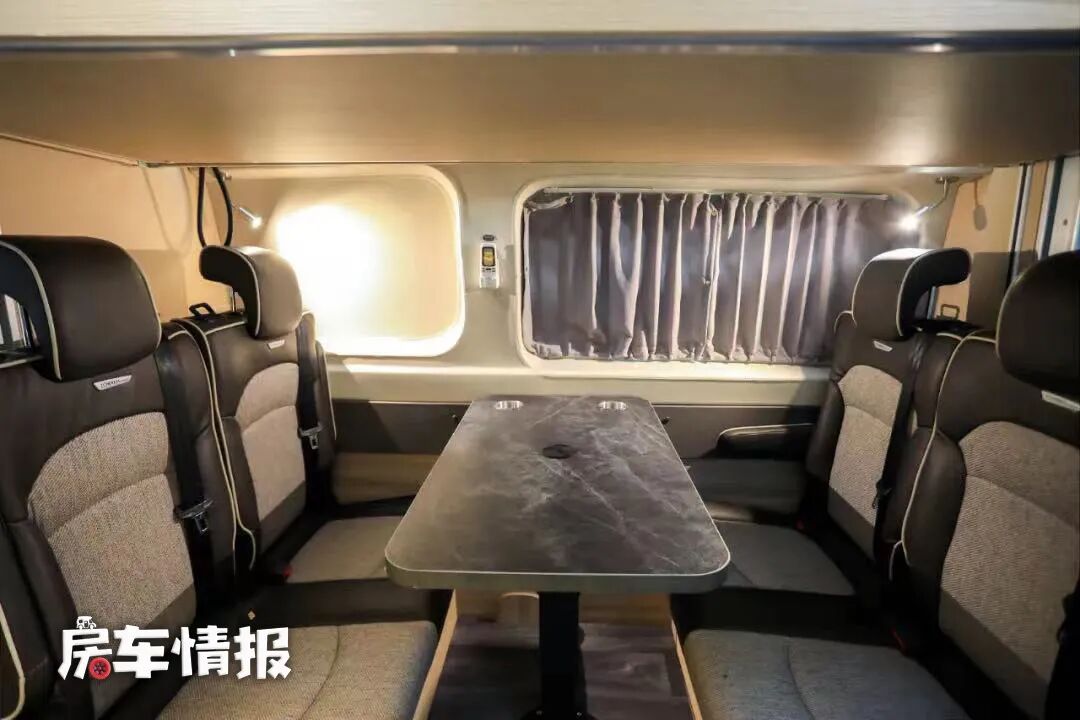 车厢内部整体的风格更加偏向商务风,会客区的布局是采用了C型房车经典的四人对卡座设计,中间提供了一张可升降的餐桌,四人卡座沙发都配有安全带,所以行车时也可以坐人,亲肤透气的材质长时间乘坐也不会感觉不舒服。
