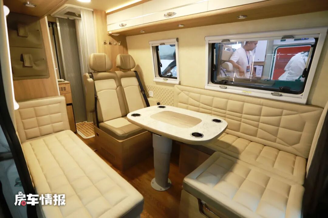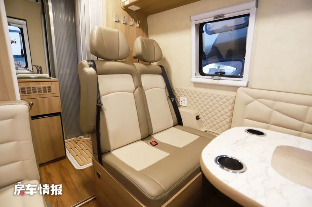 车厢内部的布局不同于以往我们常见的B型房车布局,取消了常见的尾床,而是加入了一个超大会客区的设计,会客区采用了一个环形沙发的布局,驻车以后可以坐下7人,其中面向前方的两个沙发座椅带有安全带,平时行车时可以坐人。
