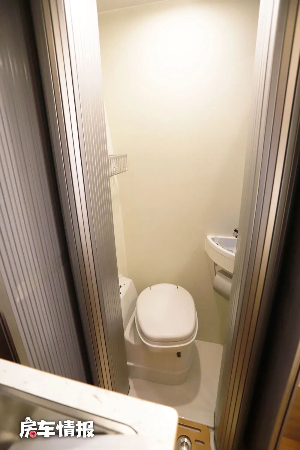 橱柜旁边则是全车的卫浴室,属于半开放式的,内部提供了小型的洗手池、旋转马桶、梳妆镜和淋浴花洒,虽然空间上比较窄小,但是可以满足基本的洗漱需求。