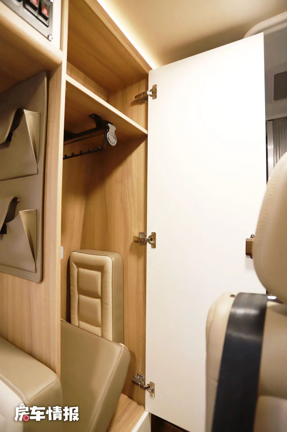 临近车门处还提供了一个大尺寸的储物衣柜,平时可以挂放一些容易褶皱的衣物或鞋。