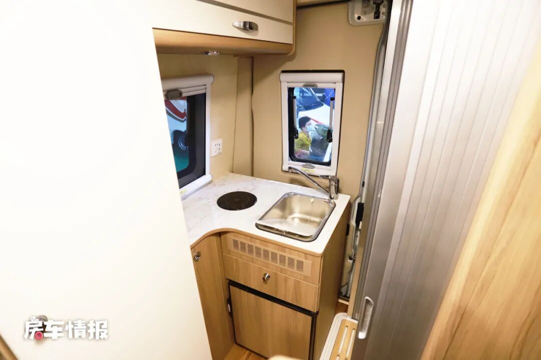 因为沙发取代了平时的厨房操作台,所以整车的厨房区也被移至到了车尾部,采用了L型吧台的设计,台面上提供了一个带盖的不锈钢洗菜池和电磁炉,下方则镶嵌了一台49L的车载冰箱,空间虽然不大,但是也足够两个人储存食物。