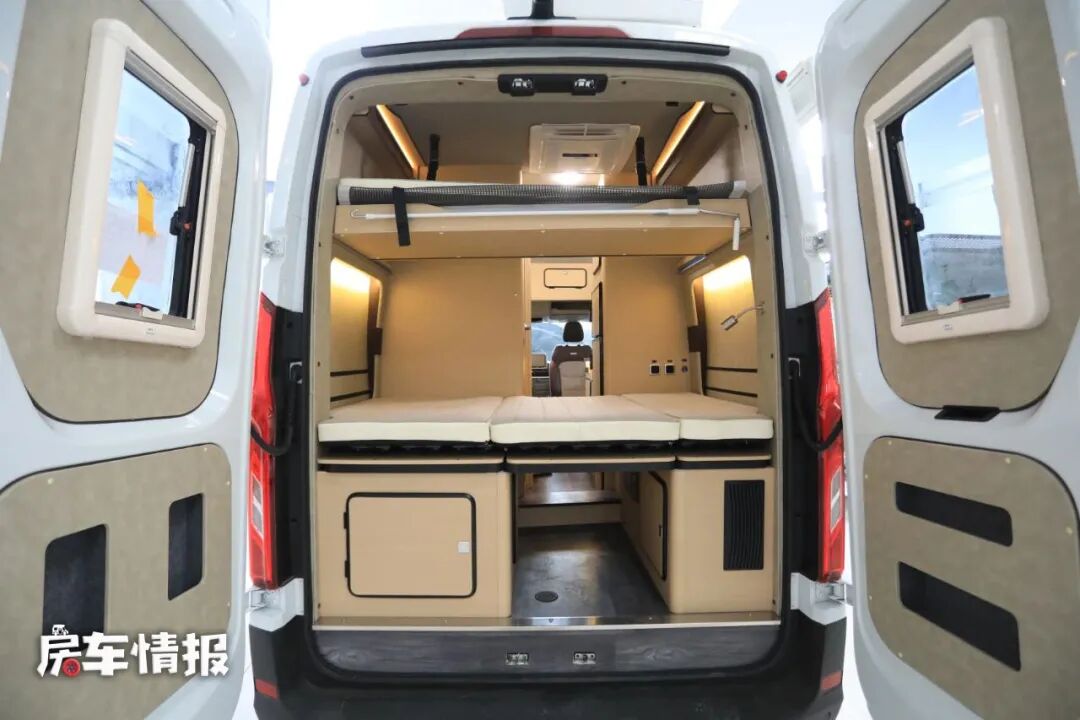 尾部的休息区内提供了横置的上下床,能够容纳两个成年人睡觉休息使用,打开后尾门可以看到隐藏在床板下方的储物格,这款房车提供了容量高达1000L的储物空间,足以满足平日的储物需求。