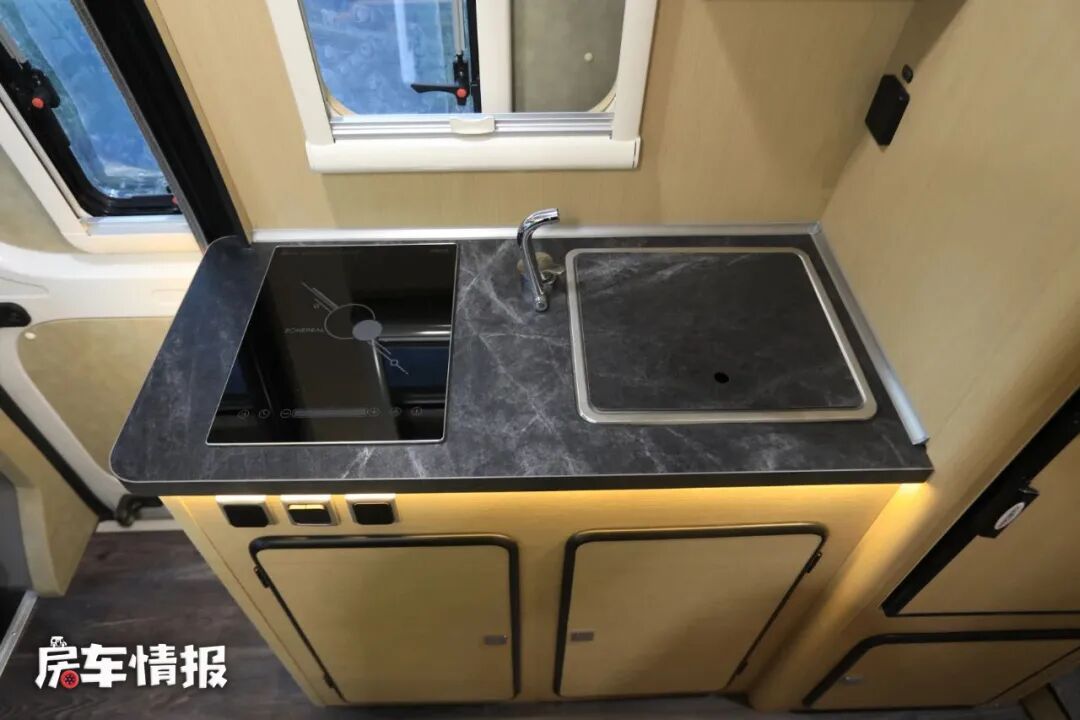 厨房操作台的面积还是挺大的,提供了带盖的不锈钢水盆以及电磁炉,同时上下方都提供了非常充足的储物空间,可以存放锅碗瓢。此外,全车还提供了一台冰箱,空间也足够存放平时的瓜果蔬菜。
