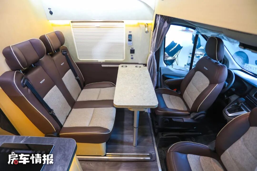 驾驶室主副驾驶座椅都可向后旋转,与后方的一排双人沙发形成一个面对面的交流空间,餐桌的面积不是很大,但是坐在这里简单的吃饭喝茶还是足够的。另外沙发座椅都使用了乘用车级别,采用亲肤的皮麻混搭材质,并带有头枕,另外还可以调节靠背角度,乘坐起来舒适度还是不错的。