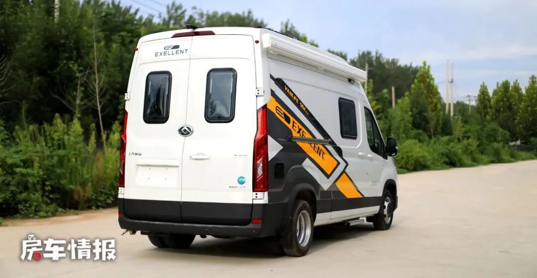 这款房车的外观看起来非常的有特色,虽然同样是以白色为主色调,但是车尾增加了亮眼的装饰彩条,所以整体看起来非常的运动化。