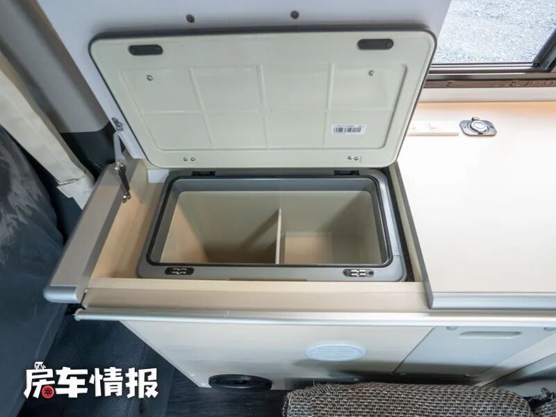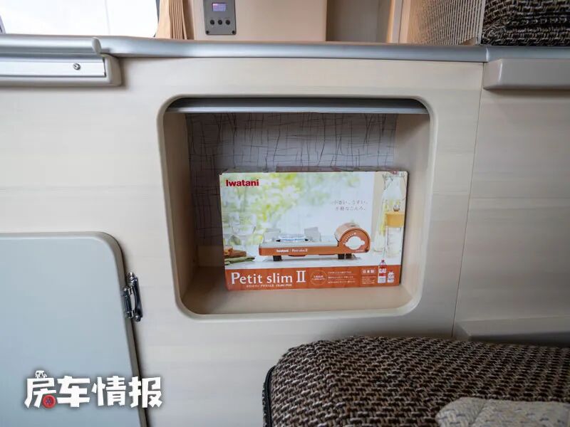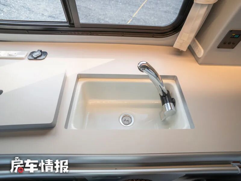 靠近车身右侧的区域提供了一长排的储物箱体,上面提供了翻盖冰箱、带盖的水槽以及一台便携式的燃气灶,平时出行的做饭需求还是完全可以满足的。