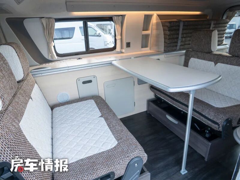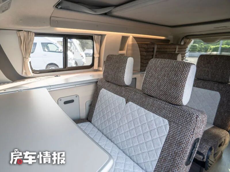 从车身左侧进入车厢内部,整体看起来并不像我们常见的房车模样,更像是一辆原装的小客车,第二排和第三排的座椅并没有改动,所以整车在行驶过程中最多可以乘坐7人。