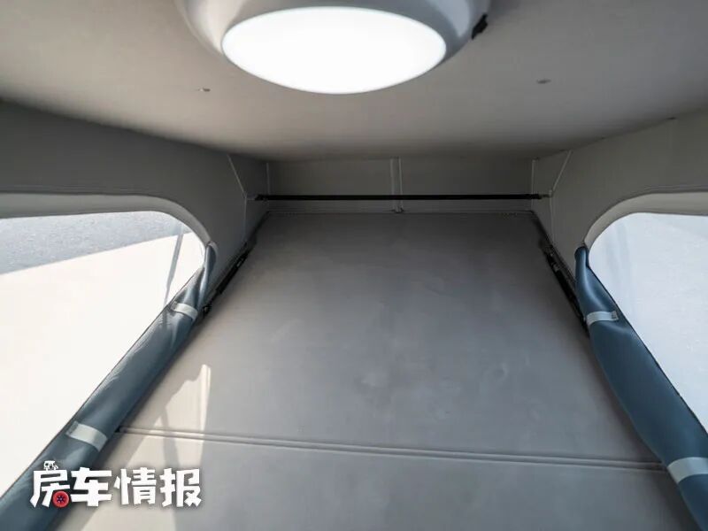 车顶部的带有照明灯,把升顶机构打开后,可以看到上方升顶机构内的双人床,平时也可以容纳两个成年人睡觉休息使用。升顶区域两侧都带有纱窗,采光度也还不错,平时也可以打开纱窗通风换气。
