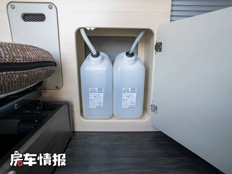 水电方面,这款房车提供了100Ah的子电池,并提供了电源插座,水路上则提供了10L的净水箱和10L的灰水箱。