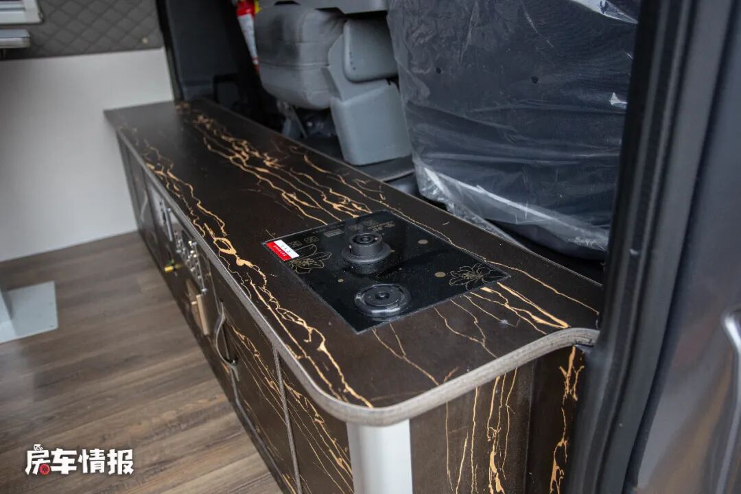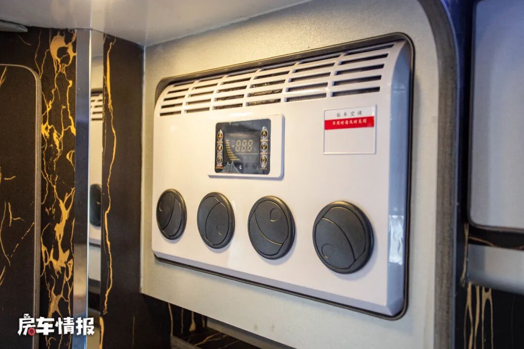 位于驾驶室后方提供了一个条形柜,这里不仅设有车内的灯光水电控制面板,还在外侧提供了一个固定式的电烧水炉,对于喜爱喝茶的人来说挺方便。