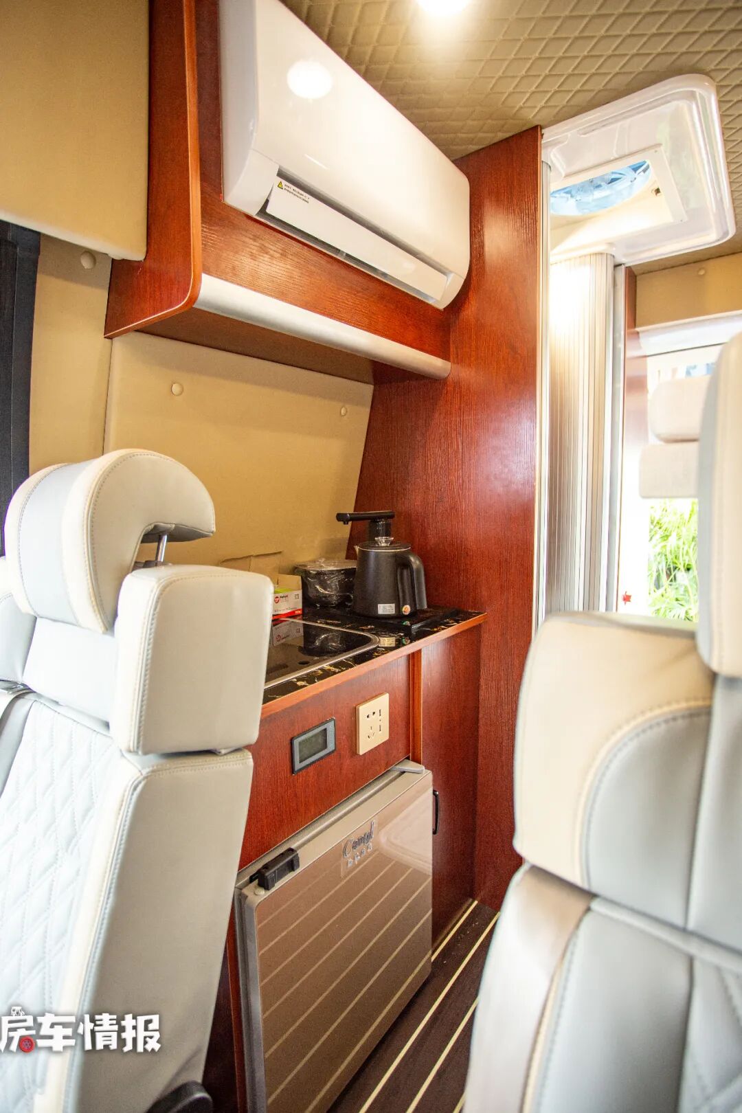 车内的厨房区域提供了洗菜池、冰箱、空调等设备,并且也提供了一个可供烧热水的电水壶基座,同样可以满足品茶人士的需求。