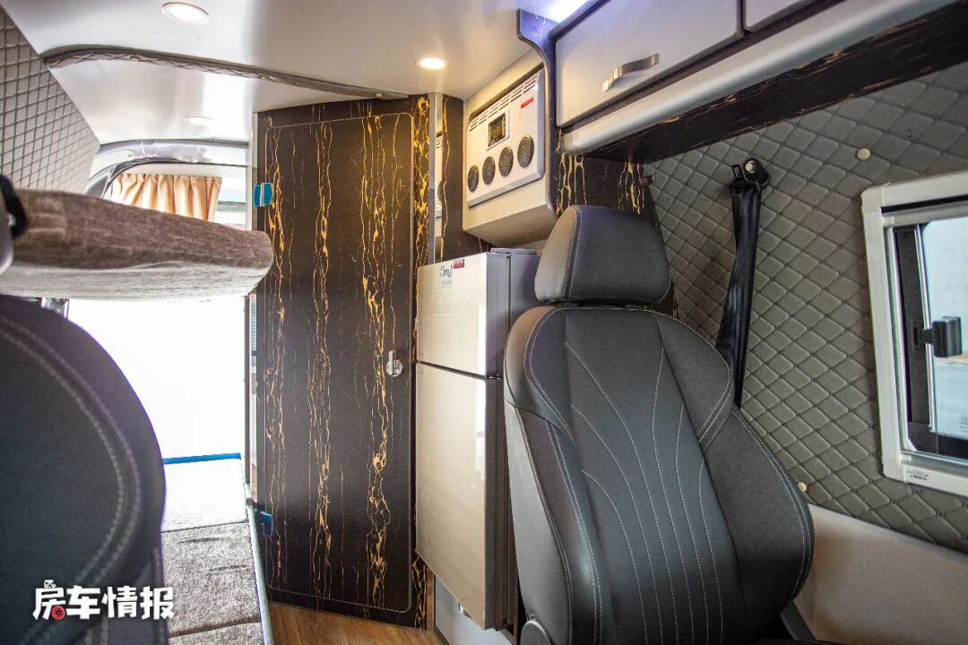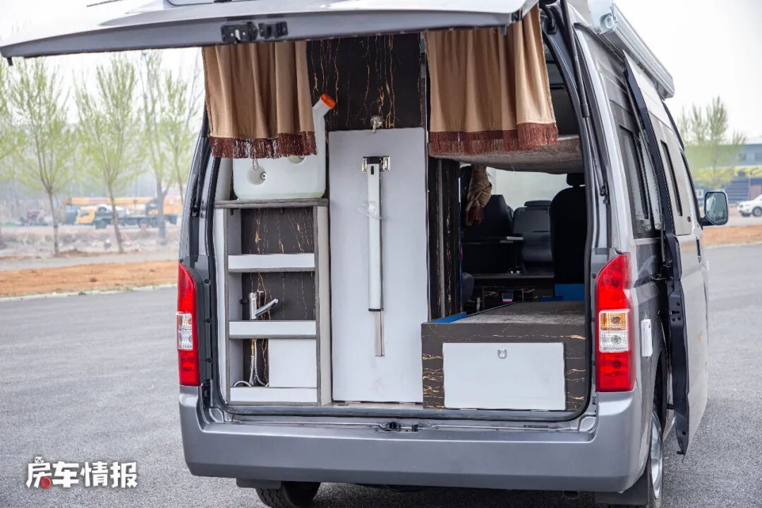 车厢后方另一侧提供了12V房车专用空调、车载冰箱以及一个卫生间,值得注意的是受限于车身高度,卫生间内部空间比较一般,基本上身高在160cm以上的人是无法直立的。
