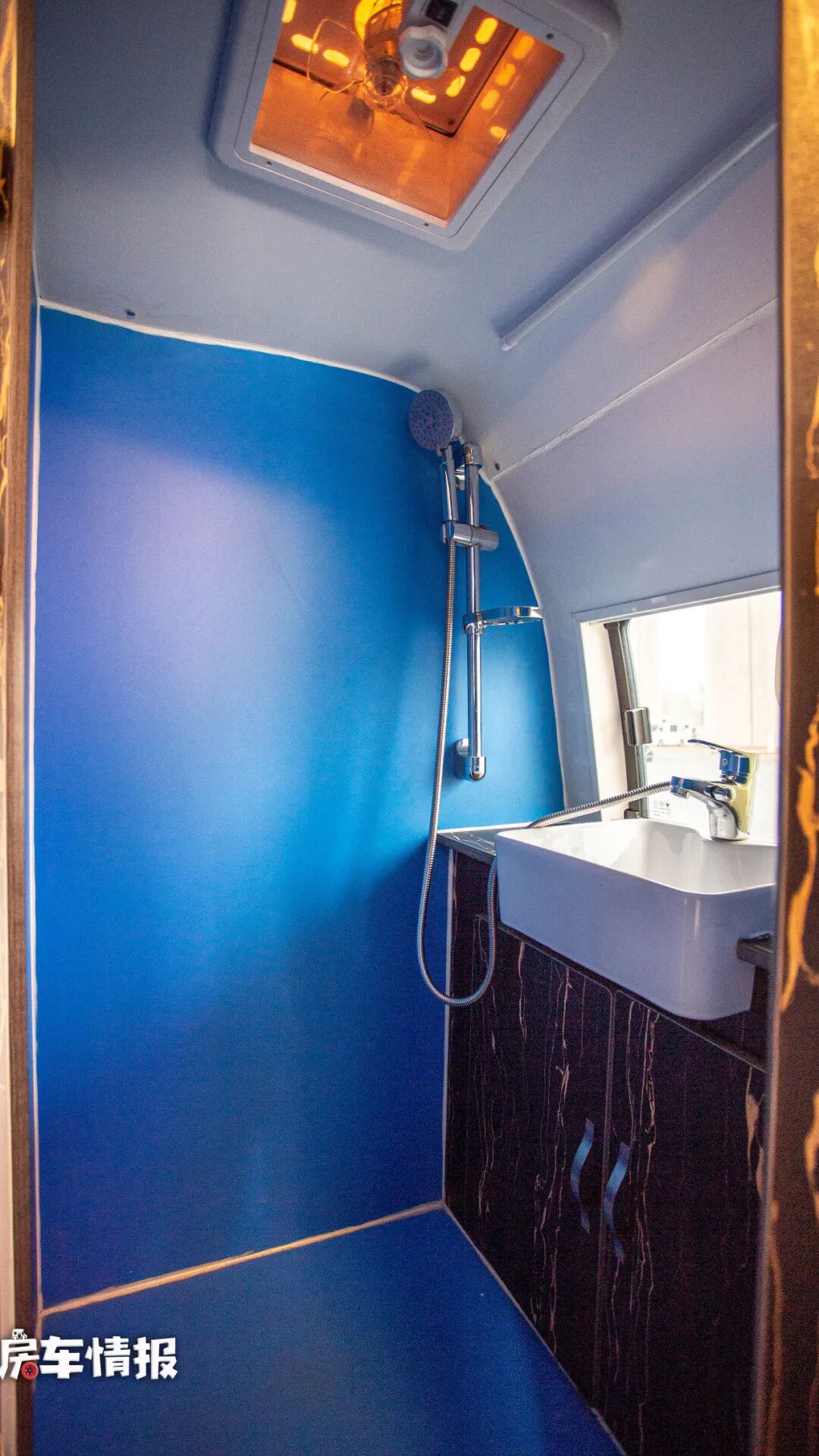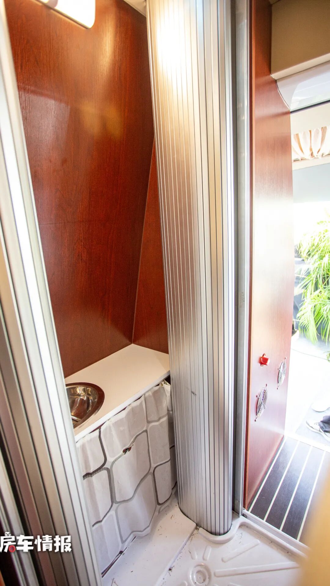 车内的卫生间采用推拉门的设计,内部空间比起前面那款车要大了不少,成年人在里边可以站立活动。