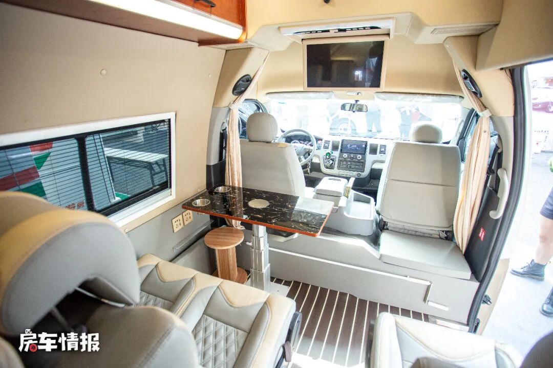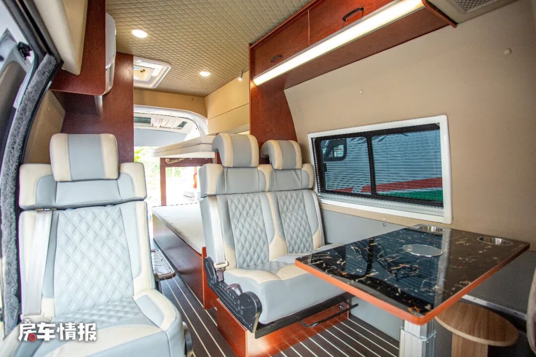 接下来看看白色款车型的内部,车厢中部依然是座椅+升降餐桌的布局形式,可以满足日常使用,优点是驻车以后驾驶室座椅也可向后旋转,与后方形成一个小会客区域,提升了日常乘坐的互动性。