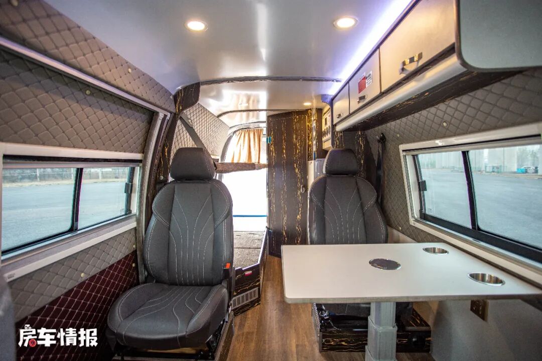 进入车厢内部,两款车也是采用了不同的设计思路,先来看看深色款车型的内部设计,车厢中部的休息区采用两张单人座椅+折叠餐桌的布局方式,既能够保证日常乘坐舒适性,同时也提升了一定的实用性。