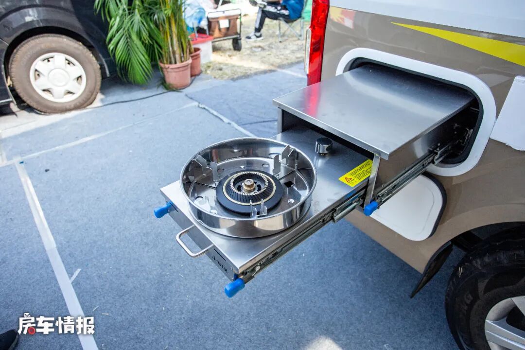 而白色款车型除了常规的遮阳棚外,在车身右侧后方还提供了一个抽拉式燃气灶,对于一辆B型房车来说,添加外置抽拉燃气灶需要对车身进行开模,成本、工艺要求更高,当然啦,也提高了日常使用的便利性。