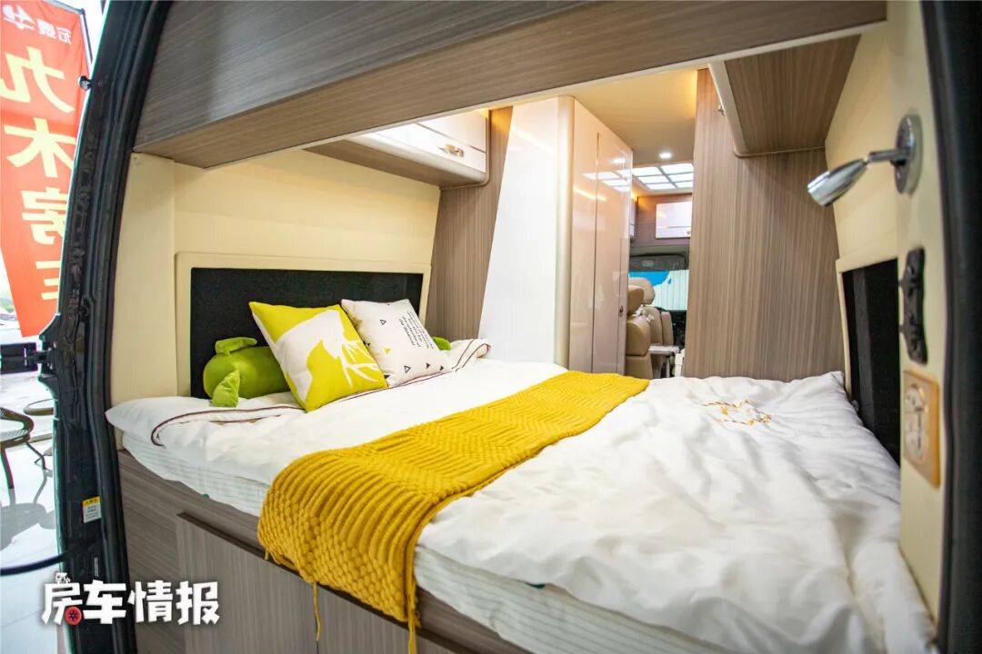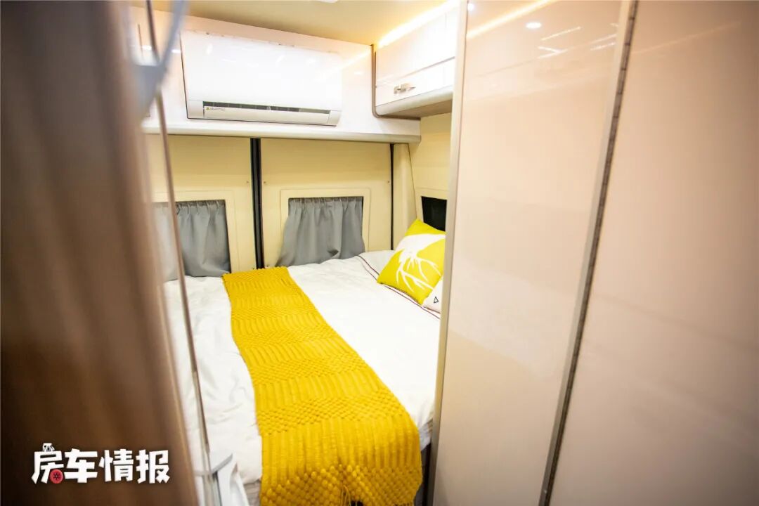来到车厢尾部就是车内的主休息区,一张尺寸达到了1800*1300mm的横置双人床,尺寸挺大,基本上1米8以下的人都可以在这里轻松躺卧。位于床位上方还提供了一台12V直流变频空调。