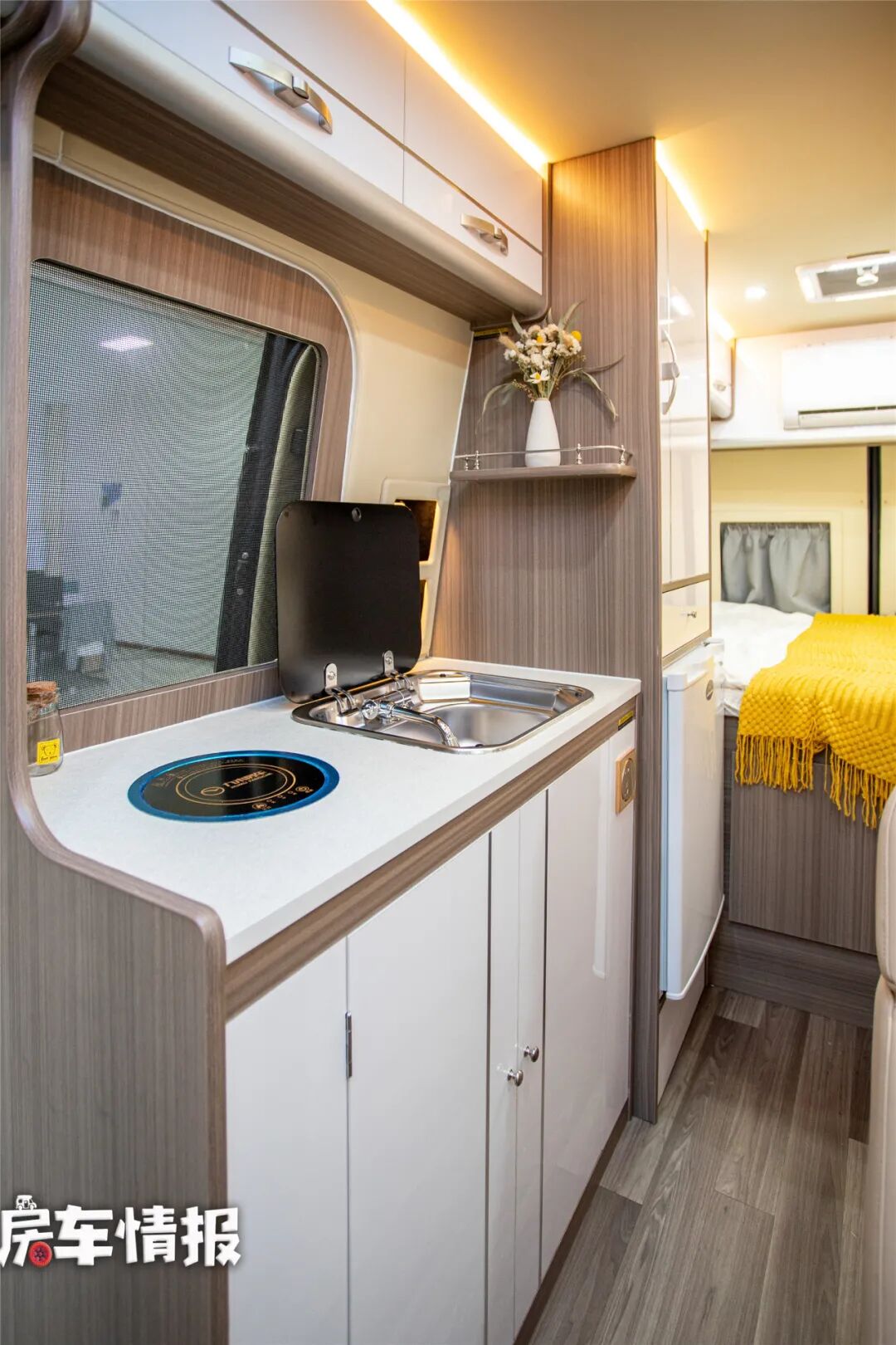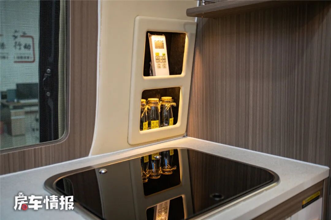 靠近车厢侧滑门便是车内的厨房区域,这里提供了800W电磁炉、洗菜池、双向开门的储物柜等,基本上可以满足日常在这里烧水、洗菜等需求,位于厨房内侧还提供了一个小尺寸的储物格,便于把要遥控器等小件物品收纳其中。