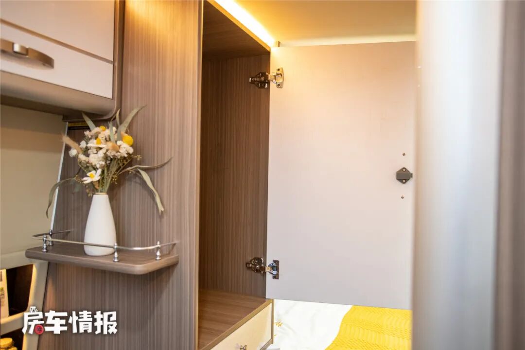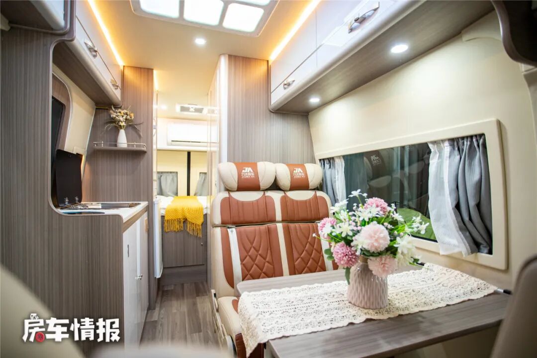 来到生活区,受限于车身尺寸内部空间并不是很大,但能够满足2-3人的正常使用,明亮简洁的配色和设计风格比较符合时下所流行的简约风。