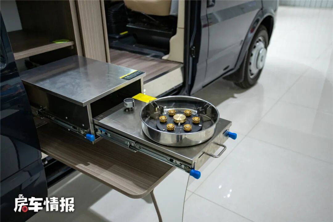 打开车厢侧滑门,位于这里提供了一部抽拉式燃气灶、抽拉式调料瓶置物架以及220V外接电源插口等,便于在车外做饭。
