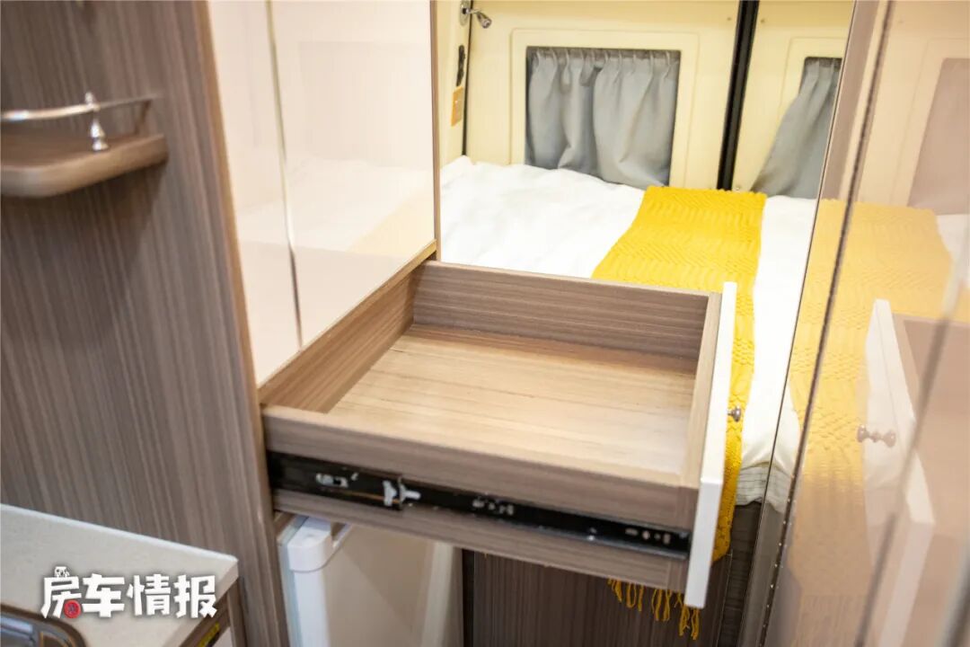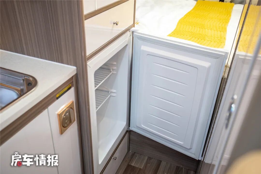 在下方则是一台容积为71L的全冷冻房车专用冰箱,可以根据自己实际使用场景适时地调整冰箱温度,当然后期也可以选装容积更大的冰箱,只不过这样就要缩小上方的储物柜。