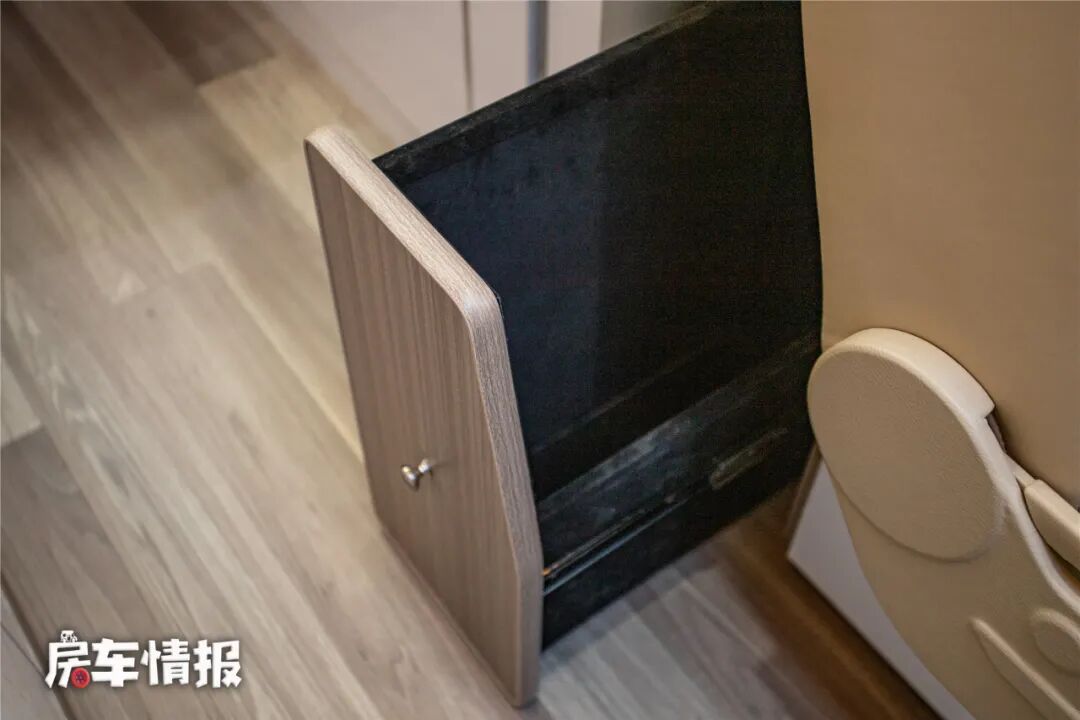 位于双人座椅后方,还提供了一个尺寸不是很大的抽拉式鞋架,当进入车内以后 ,可以在这里更换拖鞋等,值得一提的是,在这个小鞋柜的内侧还采用了植绒包裹,细节处理的挺到位。